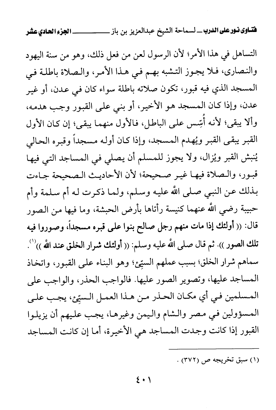 التساهل في هذا الأمر؛ لأن الرسول لعن من فعل ذلك، وهو من سنة اليهود والنصارى، فلا يجوز التشبه بهم في هذا الأمر، والصلاة باطلة في المسجد الذي فيه قبور، تكون صلاته باطلة سواء كان في عدن، أو غير عدن، وإذا كان المسجد هو الأخير، أو بني على القبور وجب هدمه، وألا يبقى؛ لأنه أسس على الباطل، فالأول منهما يبقى؛ إن كان الأول القبر يبقى القبر ويهدم المسجد، وإذا كان أوله مسجدا وقبره الحالي ينبش القبر ويزال، ولا يجوز للمسلم أن يصلي في المساجد التي فيها قبور، والصلاة فيها غير صحيحة؛ لأن الأحاديث الصحيحة جاءت بذلك عن النبي صلى الله عليه وسلم، ولما ذكرت له أم سلمة وأم حبيبة رضي الله عنهما كنيسة رأتاها بأرض الحبشة، وما فيها من الصور قال: «أولئك إذا مات منهم رجل صالح بنوا على قبره مسجدا، وصوروا فيه تلك الصور (¬1)». ثم قال صلى الله عليه وسلم: «أولئك شرار الخلق عند الله (¬2)» سماهم شرار الخلق؛ بسبب عملهم السيئ؛ وهو البناء على القبور، واتخاذ المساجد عليها، وتصوير الصور عليها. فالواجب الحذر، والواجب على المسلمين في أي مكان الحذر من هذا العمل السيئ، يجب على المسؤولين في مصر والشام واليمن وغيرها، يجب عليهم أن يزيلوا القبور إذا كانت وجدت المساجد هي الأخيرة، أما إن كانت المساجد