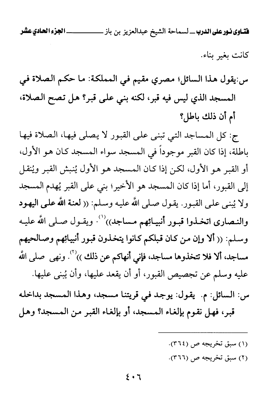 ج: كل المساجد التي تبنى على القبور لا يصلى فيها، الصلاة فيها باطلة، إذا كان القبر موجودا في المسجد سواء المسجد كان هو الأول، أو القبر هو الأول، لكن إذا كان المسجد هو الأول ينبش القبر وينقل إلى القبور، أما إذا كان المسجد هو الأخير؛ بني على القبر يهدم المسجد ولا يبنى على القبور. يقول صلى الله عليه وسلم: «لعنة الله على اليهود والنصارى اتخذوا قبور أنبيائهم مساجد (¬1)» ويقول صلى الله عليه وسلم: «ألا وإن من كان قبلكم كانوا يتخذون قبور أنبيائهم وصالحيهم مساجد، ألا فلا تتخذوها مساجد، فإني أنهاكم عن ذلك (¬2)» ونهى صلى الله عليه وسلم عن تجصيص القبور، أو أن يقعد عليها، وأن يبنى عليها.