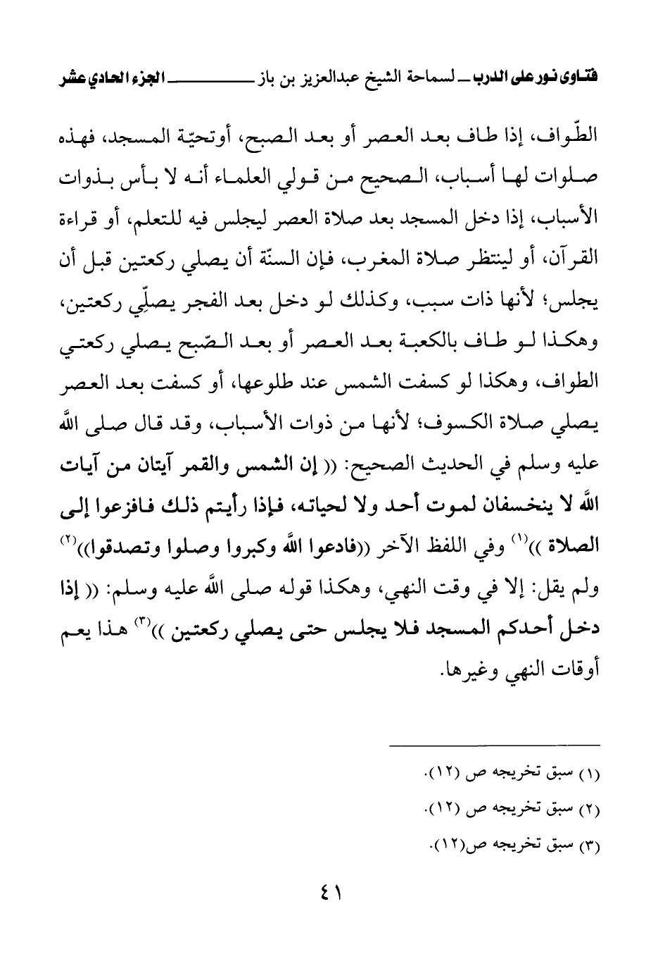 الطواف، إذا طاف بعد العصر أو بعد الصبح، أو تحية المسجد، فهذه صلوات لها أسباب، الصحيح من قولي العلماء أنه لا بأس بذوات الأسباب، إذا دخل المسجد بعد صلاة العصر ليجلس فيه للتعلم، أو قراءة القرآن، أو لينتظر صلاة المغرب، فإن السنة أن يصلي ركعتين قبل أن يجلس؛ لأنها ذات سبب، وكذلك لو دخل بعد الفجر يصلي ركعتين، وهكذا لو طاف بالكعبة بعد العصر أو بعد الصبح يصلي ركعتي الطواف، وهكذا لو كسفت الشمس عند طلوعها، أو كسفت بعد العصر يصلي صلاة الكسوف؛ لأنها من ذوات الأسباب، وقد قال صلى الله عليه وسلم في الحديث الصحيح: «إن الشمس والقمر آيتان من آيات الله لا ينخسفان لموت أحد ولا لحياته، فإذا رأيتم ذلك فافزعوا إلى الصلاة (¬1)» وفي اللفظ الآخر «فادعوا الله وكبروا وصلوا وتصدقوا (¬2)» ولم يقل: إلا في وقت النهي، وهكذا قوله صلى الله عليه وسلم: «إذا دخل أحدكم المسجد فلا يجلس حتى يصلي ركعتين (¬3)» هذا يعم أوقات النهي وغيرها.