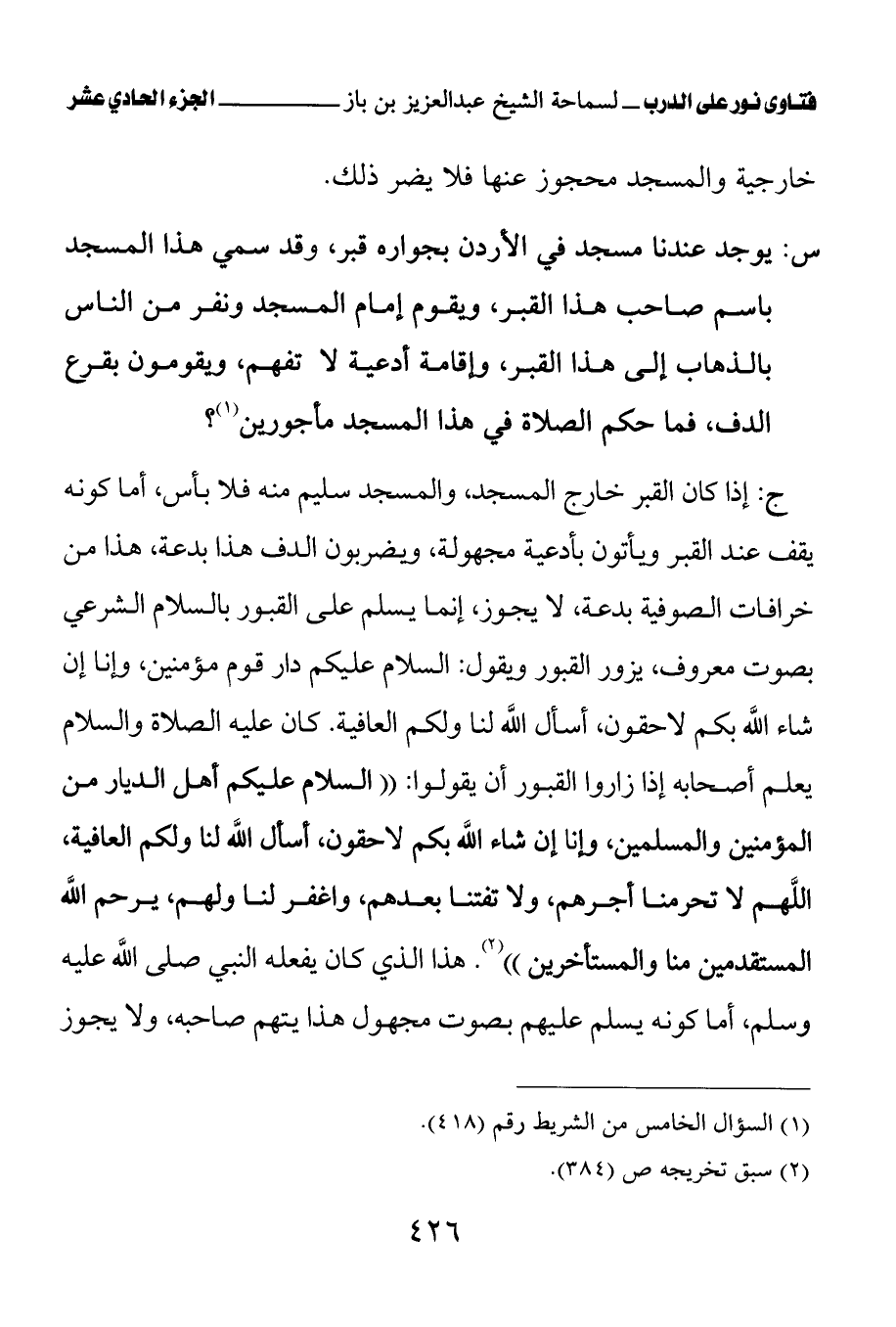 ج: إذا كان القبر خارج المسجد، والمسجد سليم منه فلا بأس، أما كونه يقف عند القبر ويأتون بأدعية مجهولة، ويضربون الدف هذا بدعة، هذا من خرافات الصوفية بدعة، لا يجوز، إنما يسلم على القبور بالسلام الشرعي بصوت معروف، يزور القبور ويقول: السلام عليكم دار قوم مؤمنين، وإنا إن شاء الله بكم لاحقون، أسأل الله لنا ولكم العافية. كان عليه الصلاة والسلام يعلم أصحابه إذا زاروا القبور أن يقولوا: «السلام عليكم أهل الديار من المؤمنين والمسلمين، وإنا إن شاء الله بكم لاحقون، أسأل الله لنا ولكم العافية، اللهم لا تحرمنا أجرهم، ولا تفتنا بعدهم، واغفر لنا ولهم، يرحم الله المستقدمين منا والمستأخرين (¬2)» هذا الذي كان يفعله النبي صلى الله عليه وسلم، أما كونه يسلم عليهم بصوت مجهول هذا يتهم صاحبه، ولا يجوز