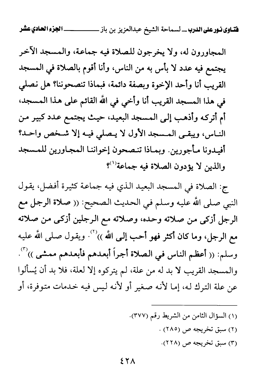 ج: الصلاة في المسجد البعيد الذي فيه جماعة كثيرة أفضل، يقول النبي صلى الله عليه وسلم في الحديث الصحيح: «صلاة الرجل مع الرجل أزكى من صلاته وحده، وصلاته مع الرجلين أزكى من صلاته مع الرجل، وما كان أكثر فهو أحب إلى الله (¬2)» ويقول صلى الله عليه وسلم: «أعظم الناس في الصلاة أجرا أبعدهم فأبعدهم ممشى (¬3)» والمسجد القريب لا بد له من علة، لم يتركوه إلا لعلة، فلا بد أن يسألوا عن علة الترك له، إما لأنه صغير أو لأنه ليس فيه خدمات متوفرة، أو