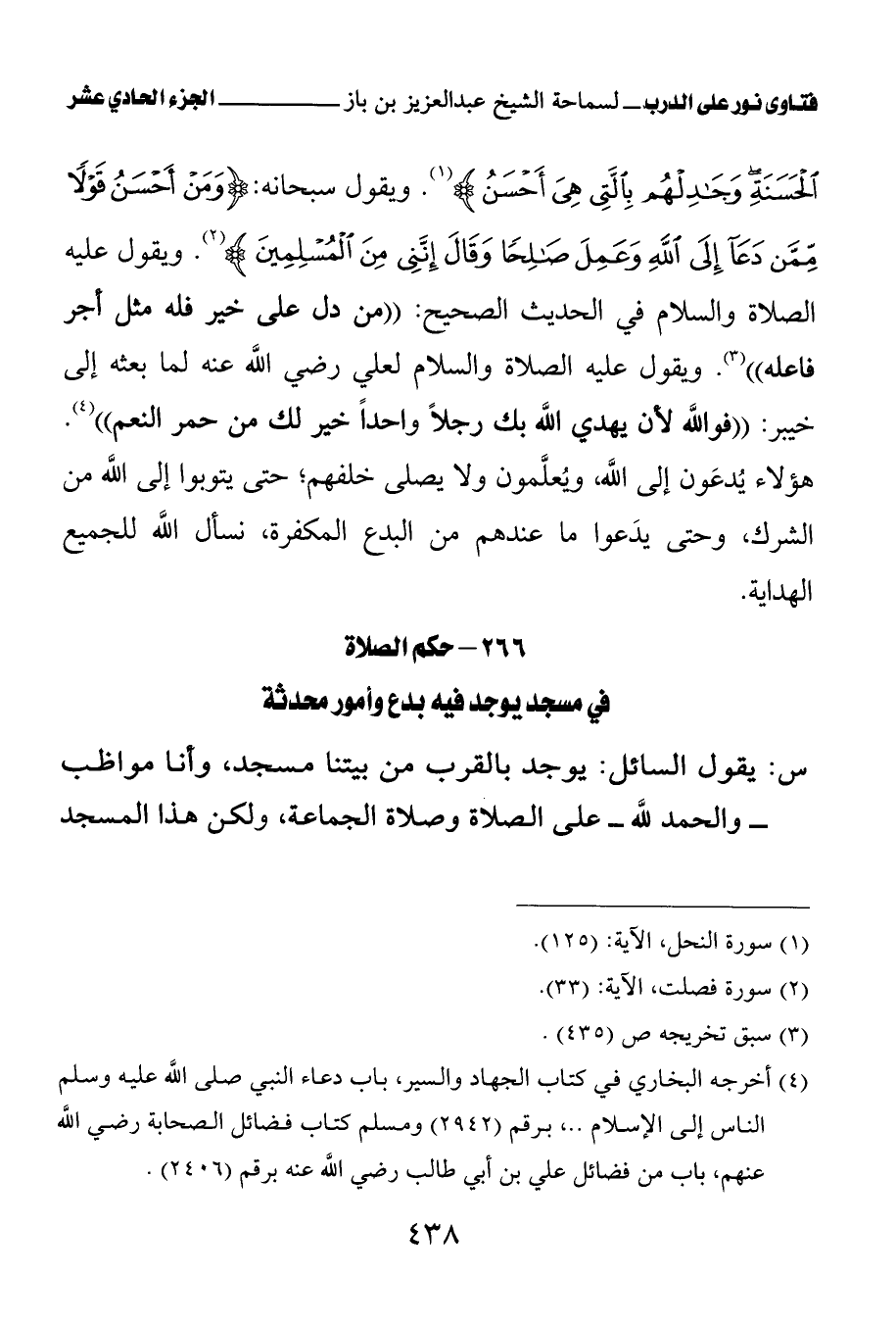 ويقول سبحانه: {وَمَنْ أَحْسَنُ قَوْلًا مِمَّنْ دَعَا إِلَى اللَّهِ وَعَمِلَ صَالِحًا وَقَالَ إِنَّنِي مِنَ الْمُسْلِمِينَ} (¬1). ويقول عليه الصلاة والسلام في الحديث الصحيح: «من دل على خير فله مثل أجر فاعله (¬2)» ويقول عليه الصلاة والسلام لعلي رضي الله عنه لما بعثه إلى خيبر: «فوالله لأن يهدي الله بك رجلا واحدا خير لك من حمر النعم (¬3)» هؤلاء يدعون إلى الله، ويعلمون ولا يصلى خلفهم؛ حتى يتوبوا إلى الله من الشرك، وحتى يدعوا ما عندهم من البدع المكفرة، نسأل الله للجميع الهداية.