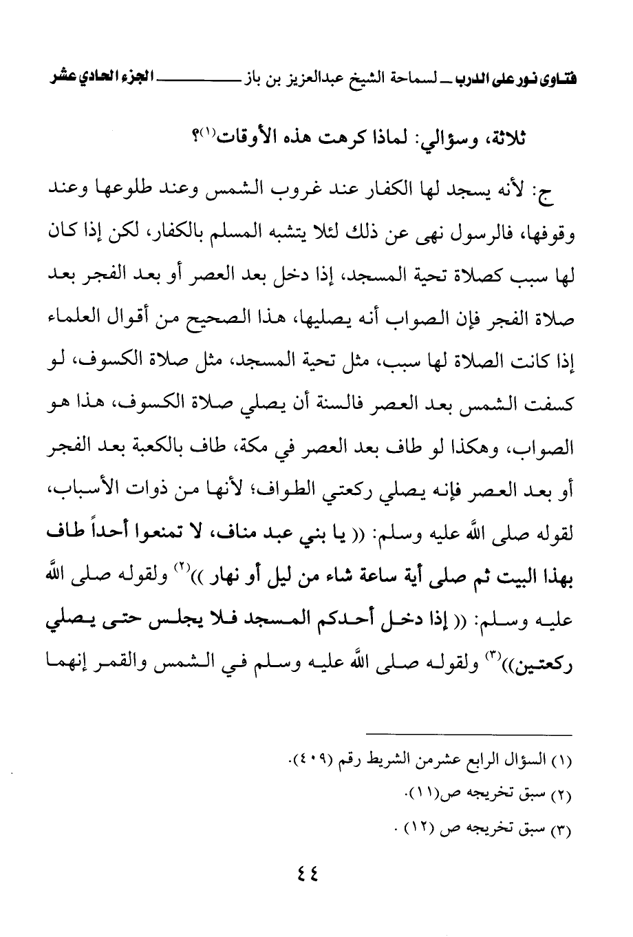 ج: لأنه يسجد لها الكفار عند غروب الشمس وعند طلوعها وعند وقوفها، فالرسول نهى عن ذلك لئلا يتشبه المسلم بالكفار، لكن إذا كان لها سبب كصلاة تحية المسجد، إذا دخل بعد العصر أو بعد الفجر بعد صلاة الفجر، فإن الصواب أنه يصليها، هذا الصحيح من أقوال العلماء إذا كانت الصلاة لها سبب، مثل تحية المسجد، مثل صلاة الكسوف، لو كسفت الشمس بعد العصر فالسنة أن يصلي صلاة الكسوف، هذا هو الصواب، وهكذا لو طاف بعد العصر في مكة، طاف بالكعبة بعد الفجر أو بعد العصر فإنه يصلي ركعتي الطواف؛ لأنها من ذوات الأسباب، لقوله صلى الله عليه وسلم: «يا بني عبد مناف، لا تمنعوا أحدا طاف بهذا البيت ثم صلى أية ساعة شاء من ليل أو نهار (¬2)» ولقوله صلى الله عليه وسلم: «إذا دخل أحدكم المسجد فلا يجلس حتى يصلي ركعتين (¬3)» ولقوله صلى الله عليه وسلم في الشمس والقمر إنهما