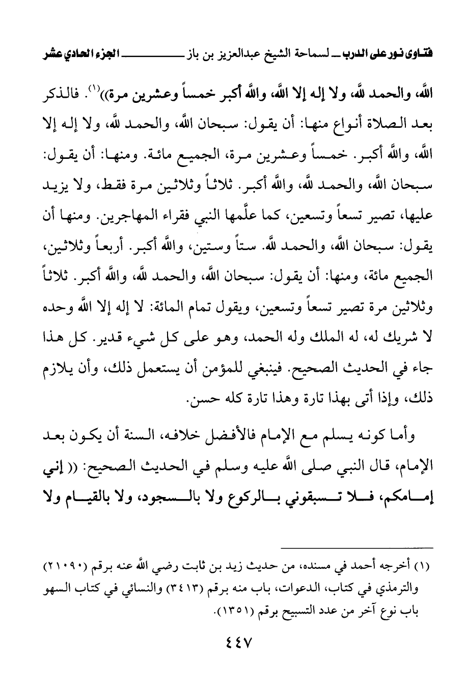 (¬1) أخرجه أحمد في مسنده، من حديث زيد بن ثابت رضي الله عنه برقم (21090) والترمذي في كتاب، الدعوات، باب منه برقم (3413) والنسائي في كتاب السهو باب نوع آخر من عدد التسبيح برقم (1351).