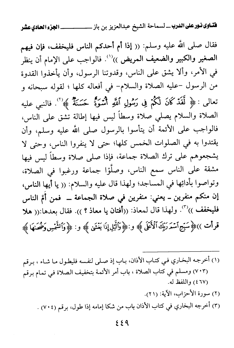 فقال صلى الله عليه وسلم: «إذا أم أحدكم الناس فليخفف، فإن فيهم الصغير والكبير والضعيف المريض (¬1)» فالواجب على الإمام أن ينظر في الأمر، وألا يشق على الناس، وقدوتنا الرسول، وأن يأخذوا القدوة من الرسول - عليه الصلاة والسلام - في أفعاله كلها؛ لقوله سبحانه وتعالى: {لَقَدْ كَانَ لَكُمْ فِي رَسُولِ اللَّهِ أُسْوَةٌ حَسَنَةٌ} (¬2). فالنبي عليه الصلاة والسلام يصلي صلاة وسطا ليس فيها إطالة تشق على الناس، فالواجب على الأئمة أن يتأسوا بالرسول صلى الله عليه وسلم، وأن يقتدوا به في الصلوات الخمس كلها؛ حتى لا ينفروا الناس، وحتى لا يشجعوهم على ترك الصلاة جماعة، فإذا صلى صلاة وسطا ليس فيها مشقة على الناس سمع الناس، وصلوا جماعة ورغبوا في الصلاة، وتواصوا بأدائها في المساجد؛ ولهذا قال عليه والسلام: «يا أيها الناس، إن منكم منفرين - يعني: منفرين في صلاة الجماعة - فمن أم الناس فليخفف (¬3)» ولهذا قال لمعاذ: «أفتان يا معاذ؟ (¬4)». فقال بعدها: «هلا قرأت " و: و: