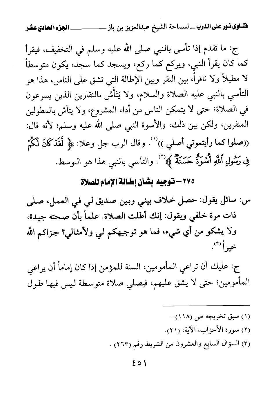 ج: ما تقدم إذا تأسى بالنبي صلى الله عليه وسلم في التخفيف، فيقرأ كما كان يقرأ النبي، ويركع كما ركع، ويسجد كما سجد، يكون متوسطا لا مطيلا ولا ناقرا، بين النقر وبين الإطالة التي تشق على الناس، هذا هو التأسي بالنبي عليه الصلاة والسلام، ولا يتأس بالنقارين الذين يسرعون في الصلاة؛ حتى لا يتمكن الناس من أداء المشروع، ولا يتأس بالمطولين المنفرين، ولكن بين ذلك، والأسوة النبي صلى الله عليه وسلم؛ لأنه قال: «صلوا كما رأيتموني أصلي (¬1)» وقال الرب جل وعلا: {لَقَدْ كَانَ لَكُمْ فِي رَسُولِ اللَّهِ أُسْوَةٌ حَسَنَةٌ} (¬2). والتأسي بالنبي هذا هو التوسط.