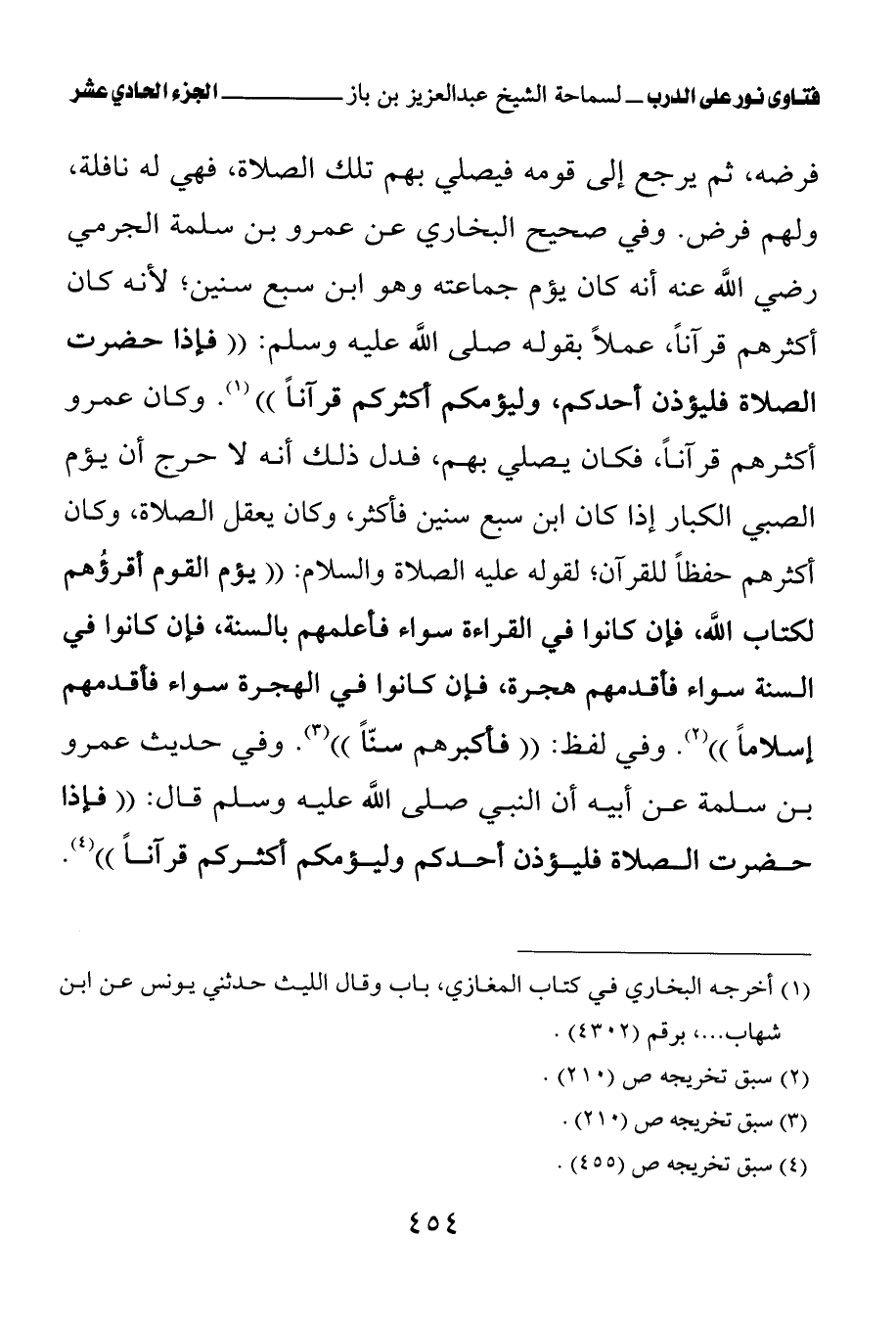 فرضه، ثم يرجع إلى قومه فيصلي بهم تلك الصلاة، فهي له نافلة، ولهم فرض. وفي صحيح البخاري عن عمرو بن سلمة الجرمي رضي الله عنه أنه كان يؤم جماعته وهو ابن سبع سنين؛ لأنه كان أكثرهم قرآنا، عملا بقوله صلى الله عليه وسلم: «فإذا حضرت الصلاة فليؤذن أحدكم، وليؤمكم أكثركم قرآنا (¬1)» وكان عمرو أكثرهم قرآنا، فكان يصلي بهم، فدل ذلك أنه لا حرج أن يؤم الصبي الكبار إذا كان ابن سبع سنين فأكثر، وكان يعقل الصلاة، وكان أكثرهم حفظا للقرآن؛ لقوله عليه الصلاة والسلام: «يؤم القوم أقرؤهم لكتاب الله، فإن كانوا في القراءة سواء فأعلمهم بالسنة، فإن كانوا في السنة سواء فأقدمهم هجرة، فإن كانوا في الهجرة سواء فأقدمهم إسلاما (¬2)» وفي لفظ: " فأكبرهم سنا " (¬3) وفي حديث عمرو بن سلمة عن أبيه أن النبي صلى الله عليه وسلم قال: «فإذا حضرت الصلاة فليؤذن أحدكم وليؤمكم أكثركم قرآنا (¬4)»