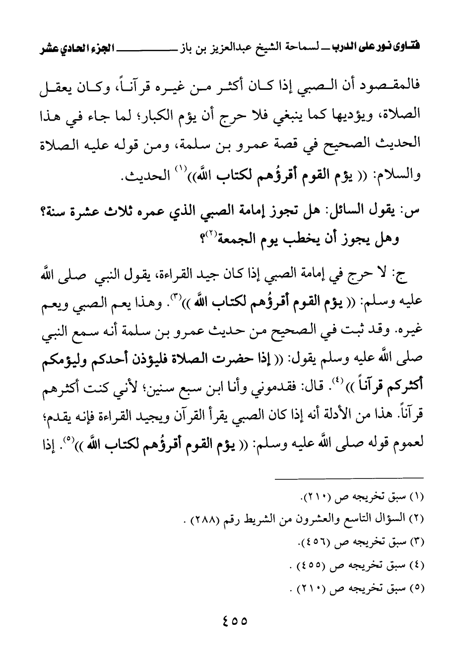 فالمقصود أن الصبي إذا كان أكثر من غيره قرآنا، وكان يعقل الصلاة، ويؤديها كما ينبغي فلا حرج أن يؤم الكبار؛ لما جاء في هذا الحديث الصحيح في قصة عمرو بن سلمة، ومن قوله عليه الصلاة والسلام: «يؤم القوم أقرؤهم لكتاب الله (¬1)» الحديث.