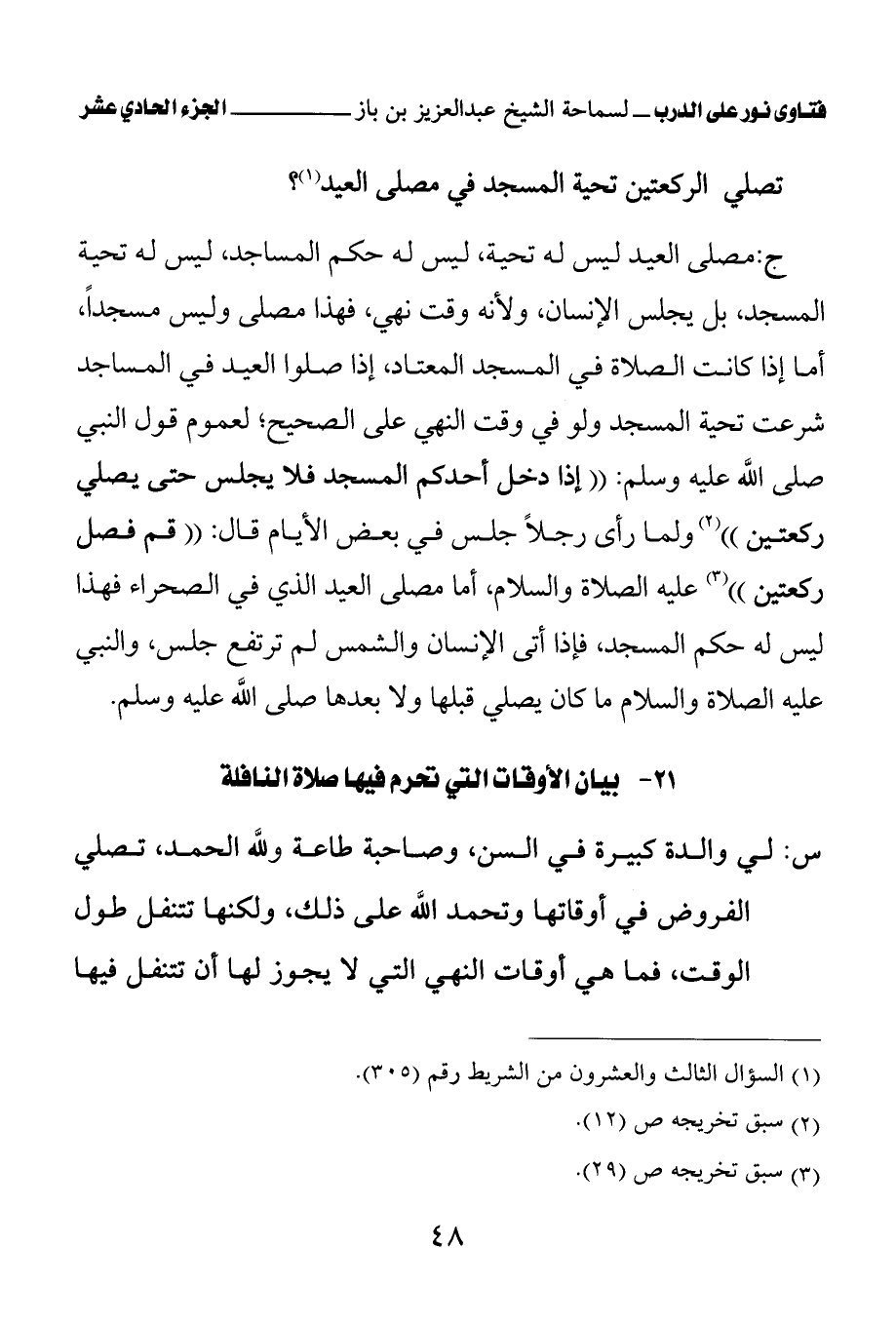 ج: مصلى العيد ليس له تحية، ليس له حكم المساجد، ليس له تحية المسجد، بل يجلس الإنسان، ولأنه وقت نهي، فهذا مصلى وليس مسجدا، أما إذا كانت الصلاة في المسجد المعتاد، إذا صلوا العيد في المساجد شرعت تحية المسجد ولو في وقت النهي على الصحيح؛ لعموم قول النبي صلى الله عليه وسلم: «إذا دخل أحدكم المسجد فلا يجلس حتى يصلي ركعتين (¬2)» ولما رأى رجلا جلس في بعض الأيام قال: «قم فصل ركعتين (¬3)» عليه الصلاة والسلام، أما مصلى العيد الذي في الصحراء فهذا ليس له حكم المسجد، فإذا أتى الإنسان والشمس لم ترتفع جلس، والنبي عليه الصلاة والسلام ما كان يصلي قبلها ولا بعدها صلى الله عليه وسلم.