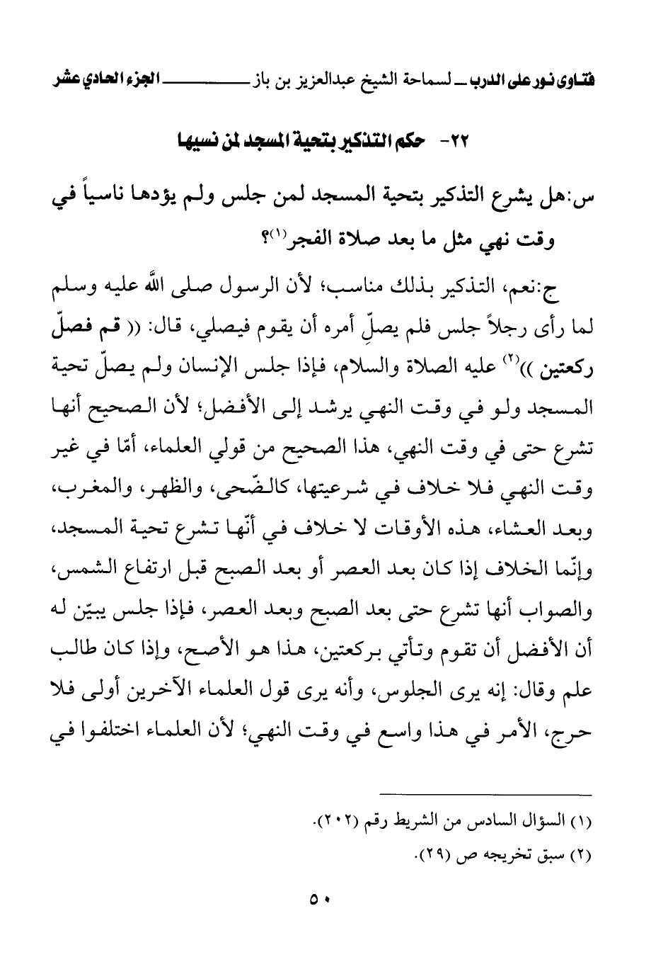 س: هل يشرع التذكير بتحية المسجد لمن جلس ولم يؤدها ناسيا في وقت نهي مثل ما بعد صلاة الفجر (¬1)؟ ج: نعم، التذكير بذلك مناسب؛ لأن الرسول صلى الله عليه وسلم لما رأى رجلا جلس فلم يصل أمره أن يقوم فيصلي، قال: «قم فصل ركعتين (¬2)» عليه الصلاة والسلام، فإذا جلس الإنسان ولم يصل تحية المسجد ولو في وقت النهي يرشد إلى الأفضل؛ لأن الصحيح أنها تشرع حتى في وقت النهي، هذا الصحيح من قولي العلماء، أما في غير وقت النهي فلا خلاف في شرعيتها، كالضحى، والظهر، والمغرب، وبعد العشاء، هذه الأوقات لا خلاف في أنها تشرع تحية المسجد، وإنما الخلاف إذا كان بعد العصر أو بعد الصبح قبل ارتفاع الشمس، والصواب أنها تشرع حتى بعد الصبح وبعد العصر، فإذا جلس يبين له أن الأفضل أن تقوم وتأتي بركعتين، هذا هو الأصح، وإذا كان طالب علم وقال: إنه يرى الجلوس، وأنه يرى قول العلماء الآخرين أولى فلا حرج، الأمر في هذا واسع في وقت النهي؛ لأن العلماء اختلفوا في
