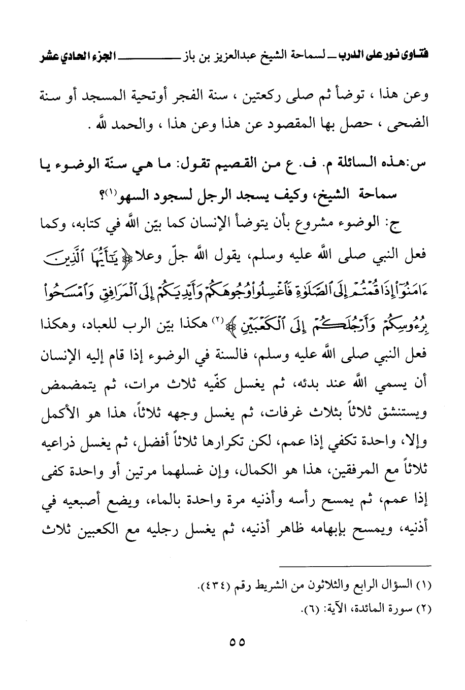 س: هذه السائلة م. ف. ع، من القصيم تقول: ما هي سنة الوضوء يا سماحة الشيخ، وكيف يسجد الرجل لسجود السهو (¬1)