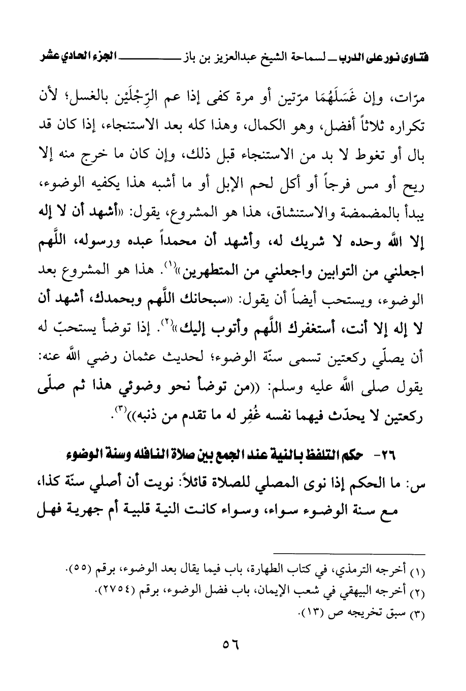 مرات، وإن غسلهما مرتين أو مرة كفى إذا عم الرجلين بالغسل؛ لأن تكراره ثلاثا أفضل، وهو الكمال، وهذا كله بعد الاستنجاء، إذا كان قد بال أو تغوط لا بد من الاستنجاء قبل ذلك، وإن كان ما خرج منه إلا ريح أو مس فرجا أو أكل لحم الإبل أو ما أشبه هذا يكفيه الوضوء، يبدأ بالمضمضة والاستنشاق، هذا هو المشروع، يقول: «أشهد أن لا إله إلا الله وحده لا شريك له، وأشهد أن محمدا عبده ورسوله، اللهم اجعلني من التوابين واجعلني من المتطهرين (¬1)» هذا هو المشروع بعد الوضوء، ويستحب أيضا أن يقول: «سبحانك اللهم وبحمدك، أشهد أن لا إله إلا أنت، أستغفرك اللهم وأتوب إليك (¬2)» إذا توضأ يستحب له أن يصلي ركعتين تسمى سنة الوضوء؛ لحديث عثمان رضي الله عنه: يقول صلى الله عليه وسلم: «من توضأ نحو وضوئي هذا ثم صلى ركعتين لا يحدث فيهما نفسه غفر له ما تقدم من ذنبه (¬3)»