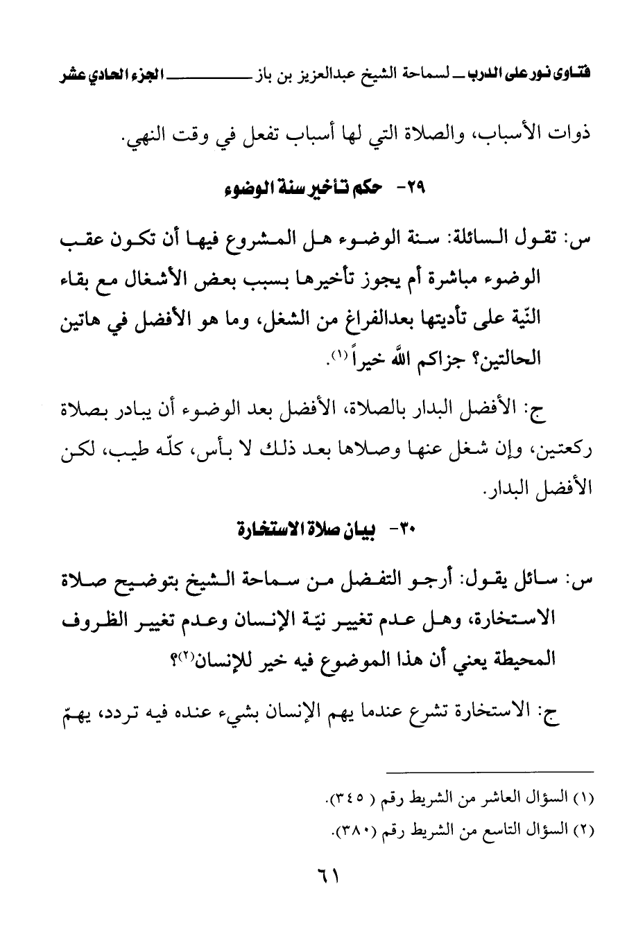 س: تقول السائلة: سنة الوضوء هل المشروع فيها أن تكون عقب الوضوء مباشرة أم يجوز تأخيرها بسبب بعض الأشغال مع بقاء النية على تأديتها بعد الفراغ من الشغل، وما هو الأفضل في هاتين الحالتين؟ جزاكم الله خيرا (¬1)