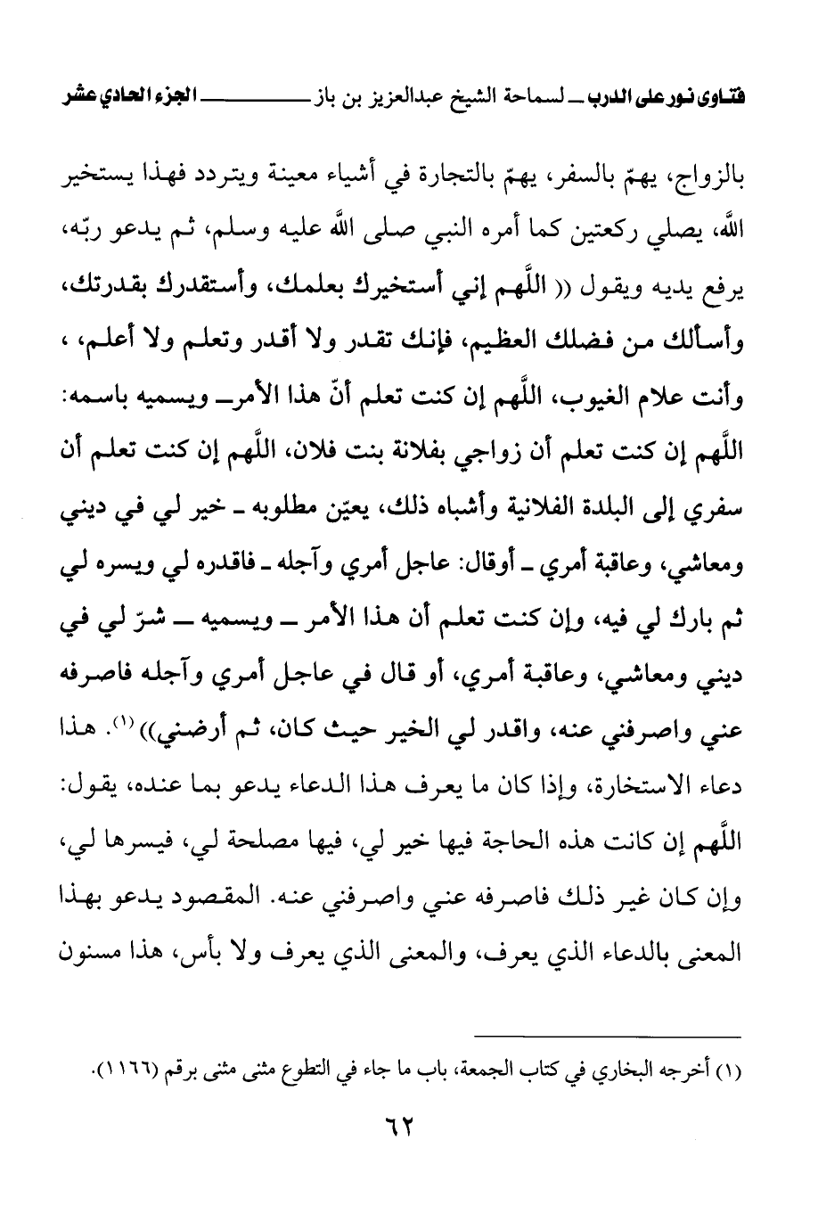 بالزواج، يهم بالسفر، يهم بالتجارة في أشياء معينة ويتردد، فهذا يستخير الله، يصلي ركعتين كما أمره النبي صلى الله عليه وسلم، ثم يدعو ربه، يرفع يديه ويقول: «اللهم إني أستخيرك بعلمك، وأستقدرك بقدرتك، وأسألك من فضلك العظيم، فإنك تقدر ولا أقدر، وتعلم ولا أعلم، وأنت علام الغيوب، اللهم إن كنت تعلم أن هذا الأمر - ويسميه باسمه: اللهم إن كنت تعلم أن زواجي بفلانة بنت فلان، اللهم إن كنت تعلم أن سفري إلى البلدة الفلانية، وأشباه ذلك، يعين مطلوبه - خير لي في ديني ومعاشي، وعاقبة أمري – أو قال: عاجل أمري وآجله - فاقدره لي ويسره لي ثم بارك لي فيه، وإن كنت تعلم أن هذا الأمر - ويسميه - شر لي في ديني ومعاشي، وعاقبة أمري، أو قال: في عاجل أمري وآجله، فاصرفه عني واصرفني عنه، واقدر لي الخير حيث كان، ثم أرضني (¬1)» هذا دعاء الاستخارة، وإذا كان ما يعرف هذا الدعاء يدعو بما عنده، يقول: اللهم إن كانت هذه الحاجة فيها خير لي، فيها مصلحة لي، فيسرها لي، وإن كان غير ذلك فاصرفه عني واصرفني عنه. المقصود يدعو بهذا المعنى بالدعاء الذي يعرف، والمعنى الذي يعرف ولا بأس، هذا مسنون