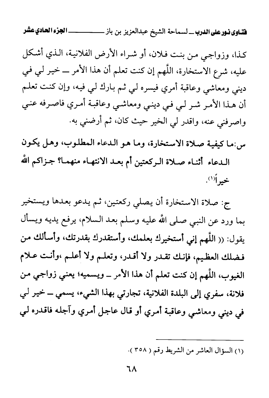كذا، وزواجي من بنت فلان، أو شراء الأرض الفلانية، الذي أشكل عليه، شرع الاستخارة، اللهم إن كنت تعلم أن هذا الأمر - خير لي في ديني ومعاشي وعاقبة أمري فيسره لي ثم بارك لي فيه، وإن كنت تعلم أن هذا الأمر شر لي في ديني ومعاشي وعاقبة أمري فاصرفه عني واصرفني عنه، واقدر لي الخير حيث كان، ثم أرضني به.