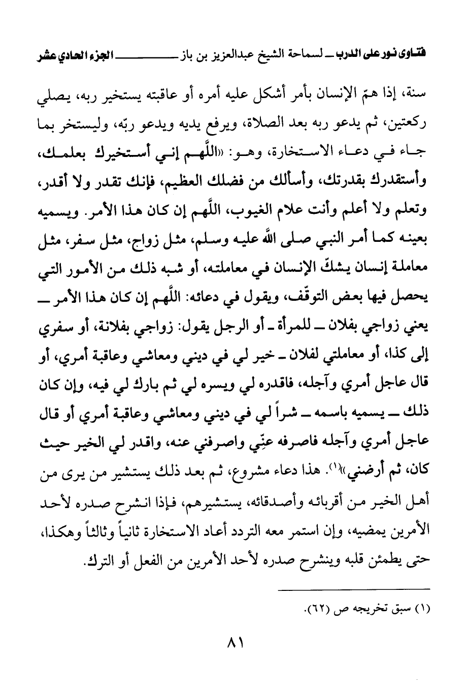 سنة، إذا هم الإنسان بأمر أشكل عليه أمره أو عاقبته يستخير ربه، يصلي ركعتين، ثم يدعو ربه بعد الصلاة، ويرفع يديه ويدعو ربه، وليستخر بما جاء في دعاء الاستخارة، وهو: «اللهم إني أستخيرك بعلمك، وأستقدرك بقدرتك، وأسألك من فضلك العظيم، فإنك تقدر ولا أقدر، وتعلم ولا أعلم وأنت علام الغيوب، اللهم إن كان هذا الأمر. ويسميه بعينه كما أمر النبي صلى الله عليه وسلم، مثل زواج، مثل سفر، مثل معاملة إنسان يشك الإنسان في معاملته، أو شبه ذلك من الأمور التي يحصل فيها بعض التوقف، ويقول في دعائه: اللهم إن كان هذا الأمر - يعني زواجي بفلان - للمرأة - أو الرجل يقول: زواجي بفلانة، أو سفري إلى كذا، أو معاملتي لفلان - خير لي في ديني ومعاشي وعاقبة أمري، أو قال عاجل أمري وآجله، فاقدره لي ويسره لي ثم بارك لي فيه، وإن كان ذلك - يسميه باسمه - شرا لي في ديني ومعاشي وعاقبة أمري أو قال عاجل أمري وآجله فاصرفه عني واصرفني عنه، واقدر لي الخير حيث كان، ثم أرضني (¬1)» هذا دعاء مشروع، ثم بعد ذلك يستشير من يرى من أهل الخير من أقربائه وأصدقائه، يستشيرهم، فإذا انشرح صدره لأحد الأمرين يمضيه، وإن استمر معه التردد أعاد الاستخارة ثانيا وثالثا وهكذا، حتى يطمئن قلبه وينشرح صدره لأحد الأمرين من الفعل أو الترك.