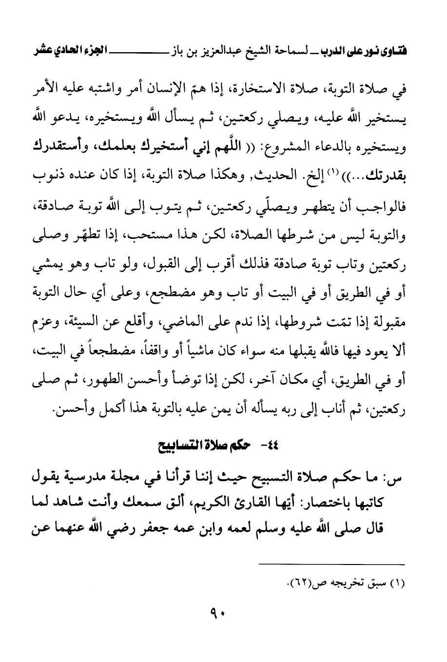 في صلاة التوبة، صلاة الاستخارة، إذا هم الإنسان أمر واشتبه عليه الأمر يستخير الله عليه، ويصلي ركعتين، ثم يسأل الله ويستخيره، يدعو الله ويستخيره بالدعاء المشروع: «اللهم إني أستخيرك بعلمك، وأستقدرك بقدرتك (¬1)» إلخ. الحديث , وهكذا صلاة التوبة، إذا كان عنده ذنوب فالواجب أن يتطهر ويصلي ركعتين، ثم يتوب إلى الله توبة صادقة، والتوبة ليس من شرطها الصلاة، لكن هذا مستحب، إذا تطهر وصلى ركعتين وتاب توبة صادقة فذلك أقرب إلى القبول، ولو تاب وهو يمشي أو في الطريق أو في البيت أو تاب وهو مضطجع، وعلى أي حال التوبة مقبولة إذا تمت شروطها، إذا ندم على الماضي، وأقلع عن السيئة، وعزم ألا يعود فيها فالله يقبلها منه سواء كان ماشيا أو واقفا، مضطجعا في البيت، أو في الطريق، أي مكان آخر، لكن إذا توضأ وأحسن الطهور، ثم صلى ركعتين، ثم أناب إلى ربه يسأله أن يمن عليه بالتوبة هذا أكمل وأحسن.
