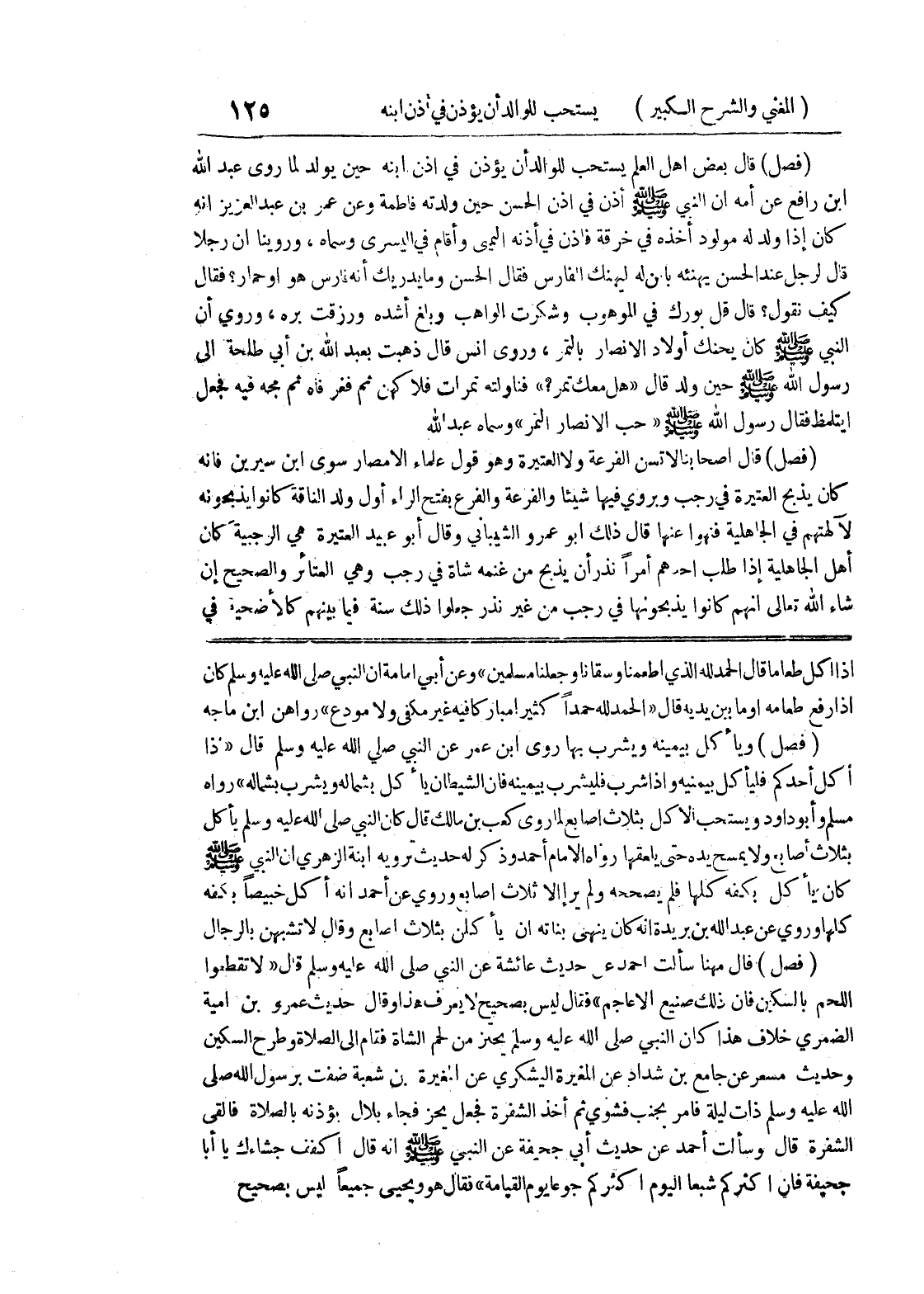 أكل أحدكم فليأكل بيمينه وإذا شرب فليشرب بيمينه فإن الشيطان يأكل بشماله ويشرب بشماله " رواه مسلم وأبو داود ويستحب الأكل بثلاث أصابع لما روى كعب بن مالك قال كان النبي صلى الله عليه وسلم يأكل بثلاث أصابع ولا يمسح يده حتى يلعقها رواه الإمام أحمد وذكر له حديث ترويه ابنة الزهري أن النبي صلى الله عليه وسلم كان يأكل بكفه كلها فلم يصححه ولم ير إلا ثلاث أصابع وروى عن أحمد أنه أكل خبيصاً بكفه كلها وروي عن عبد الله بن بريدة أنه كان ينهى بناته ان يأكلن بثلاث أصابع وقال لا تشبهن بالرجال (فصل) قال مهنا سألت أحمد عن حديث عائشة عن النبي صلى الله عليه وسلم قال " لا تقطعوا اللحم بالسكين فإن ذلك صنيع الأعاجم " فقال ليس بصحيح لا يعرف هذا وقال حديث عمرو بن أمية الضمري خلاف هذا كان النبي صلى الله عليه وسلم يحتز من لحم الشاة فقام إلى الصلاة وطرح السكين وحديث مسعر عن جامع بن شداد عن المغيرة اليشكري عن المغيرة ابن شعبة ضفت برسول الله صلى الله عليه وسلم ذات ليلة فأمر بجنب فشوي ثم أخذ الشفرة فجعل يجز فجاء بلال يؤذنه بالصلاة فألقى الشفرة قال وسألت أحمد عن حديث أبي جحيفة عن النبي صلى الله عليه وسلم انه قال اكفف جشاءك يا أبا جحيفة فإن أكثركم شبعا اليوم أكثركم جوعا يوم القيامة " فقال هو ويحيى جميعاً ليس بصحيح