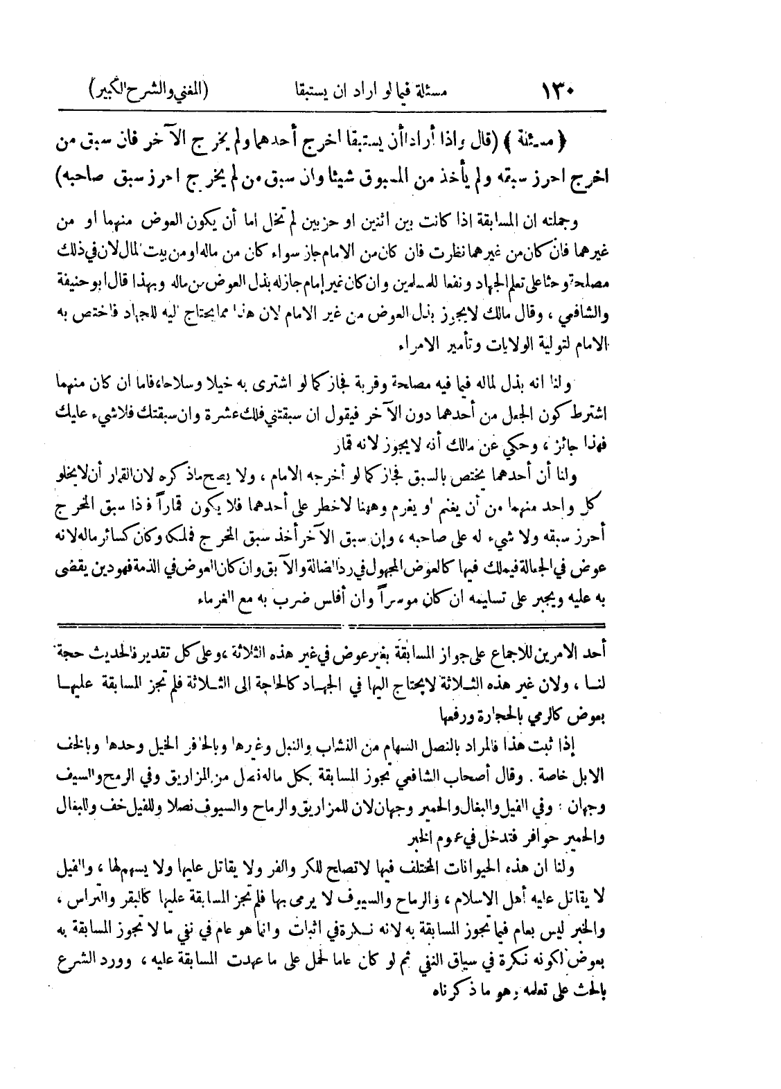 وقال أصحاب الشافعي تجوز المسابقة بكل ماله فصل من المزاريق وفي الرمح والسيف وجهان وفي الفيل والبغال والحمير وجهان لأن للمزاريق والرماح والسيوف نصلاً وللفيل خف وللبغال والحمير حوافر فتدخل في عموم الخبر ولنا أن هذه الحيوانات المختلف فيها لا تصلح للكر والفر ولا يقاتل عليها ولا يسهم لها، والفيل لا يقاتل عليه أهل الإسلام، والرماح والسيوف لا يرمى بها فلم تجز المسابقة عليها كالبقر والتراس، والخبر ليس بعام فيما تجوز المسابقة به لأنه نكرة في إثبات وإنما هو عام في نفي ما لا تجوز المسابقة به بعوض لكونه نكرة في سياق النفي ثم لو كان عاماً لحمل على ما عهدت المسابقة عليه، وورود الشرع بالحث على تعلمه وهو ما ذكرناه