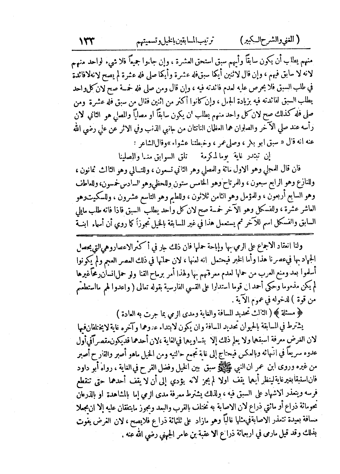 * (مسألة) * (الثالث تحديد المسافة والغاية ومدى الرمي بما جرت به العادة) يشترط في المسابقة بالحيوان تحديد المسافة وأن يكون لابتداء عدوهما وآخره غاية لا يختلفان فيها لأن الغرض معرفة اسبقهما ولا يعلم ذلك ألا بتساويهما في الغاية، لأن أحدهما قد يكون مقصراً في أول عدوه سريعاً في انتهائه وبالعكس فيحتاج إلى غاية تجمع حالتيه ومن الخيل ما هو أصبر والقارح أصبر من غيره وروى ابن عمر أن النبي صلى الله عليه وسلم سبق بين الخيل وفضل القرح في الغاية، رواه أبو داود فإن استبقا بغير غاية لينظر أيهما يقف أولاً لم يجز لأنه يؤدي إلى أن لا يقف أحدهما حتى تنقطع فرسه ويتعذر الأشهاد على السبق فيه، ولذلك يشترط معرفة مدى الرمي إما بالمشاهدة أو بالذرعان نحو مائة ذراع أو مائتي ذراع لأن الإصابة به نختلف بالقرب والبعد ويجوز ما يتفقان عليه إلا أن يجعلا مسافة بعيدة تتعذر الاصابة في مثلها غالباً وهو ما زاد على ثلثمائة ذراع فلا يصح، لأن الغرض يفوت بذلك وقد قيل ما رمى في أربعمائة ذراع إلا عقبة بن عامر الجهني رضي الله عنه.