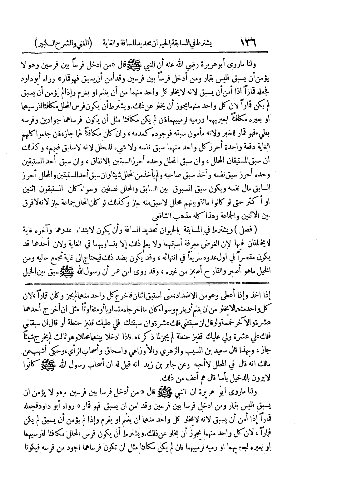 ويشترط أن يكون فرس المحلل مكافئاً لفرسيهما أو بعيره لبعيريهما أو رميه لرمييهما فإن لم يكن مكافئاً مثل أن تكون فرساهما أجود من فرسه فيكونا