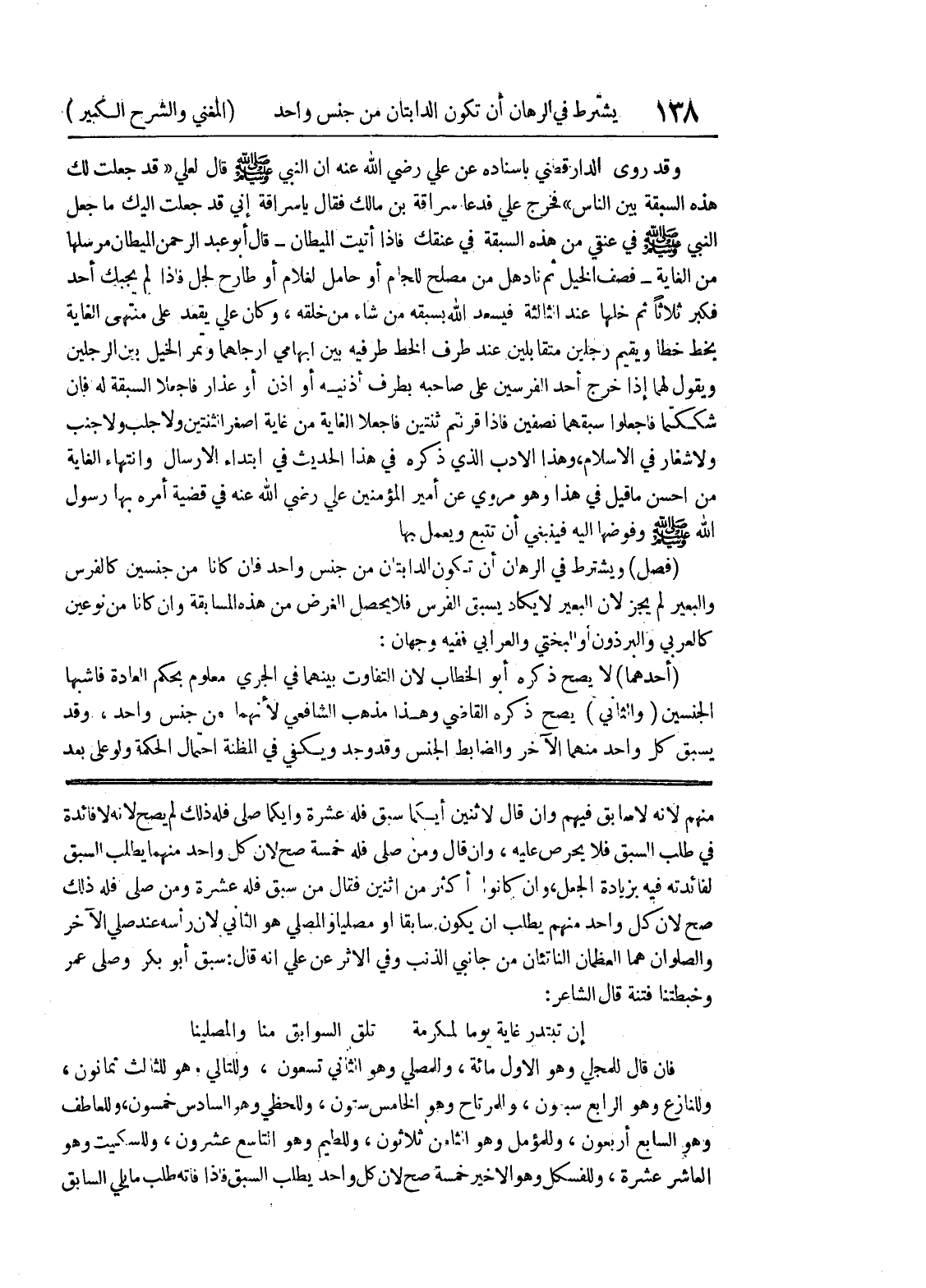 في طلب السبق فلا يحرص عليه، وان قال ومن صلى فله خمسة صح لأن كل واحد منهما يطلب السبق لفائدته فيه بزيادة الجعل، وان كانوا أكثر من اثنين فقال من سبق فله عشرة ومن صلى فله ذلك صح لأن كل واحد منهم يطلب أن يكون سابقاً أو مصليا والمصلي هو الثاني لأن رأسه عند صلي الآخر والصلوان هما العظمان الناتئان من جانبي الذنب وفي الأثر عن علي أنه قال: سبق أبو بكر وصلى عمر وخبطتنا فتنة قال الشاعر: إن تبتدر غاية يوما لمكرمة * تلق السوابق منا والمصلينا فان قال للمجلي وهو الأول مائة، وللمصلي وهو الثاني تسعون، وللتالي.