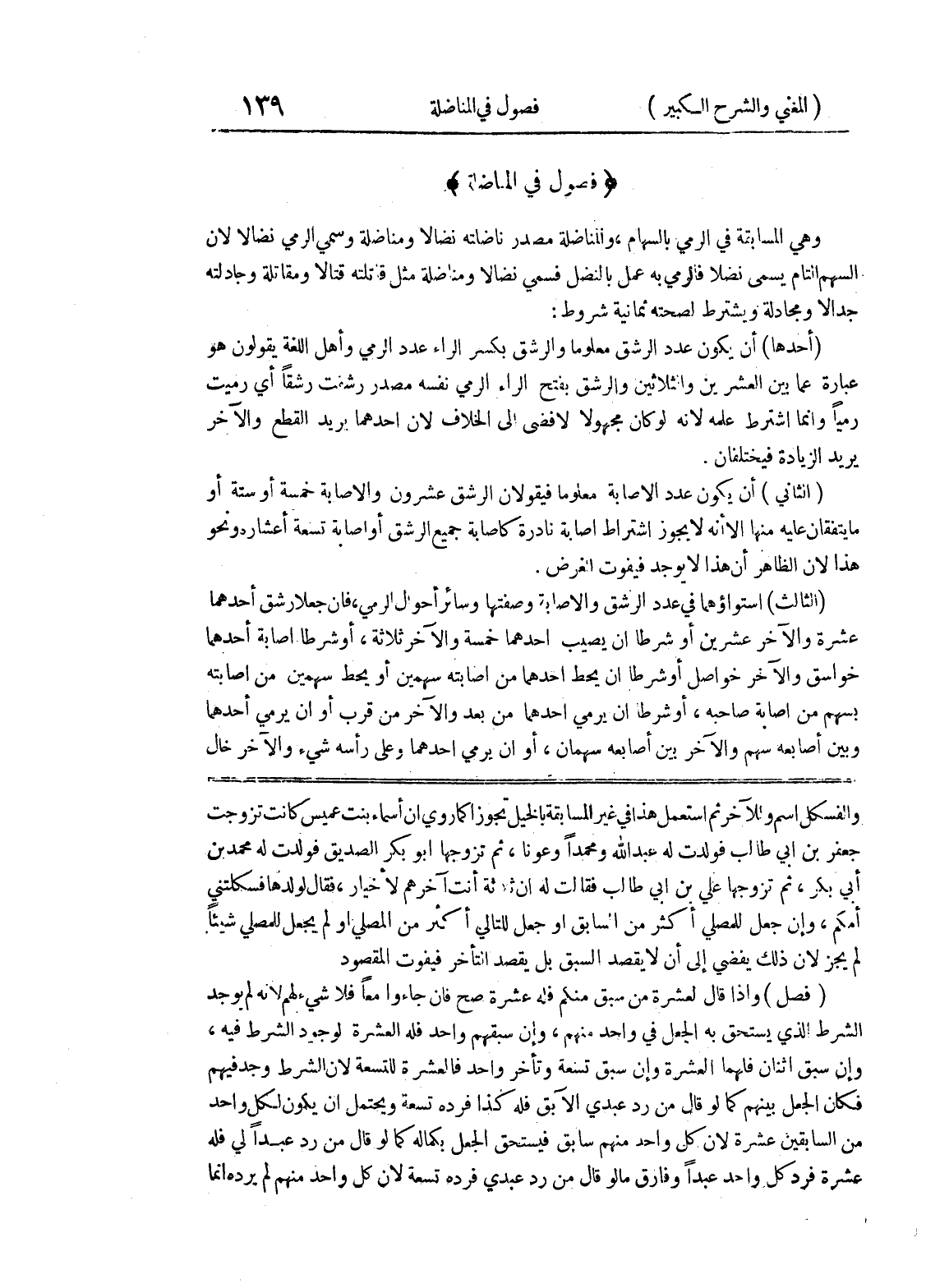 والفسكل اسم وللآخر ثم استعمل هذا في غير المسابقة بالخيل تجوزا كما روي ان أسماء بنت عميس كانت تزوجت جعفر بن أبي طالب فولدت له عبد الله ومحمداً وعونا، ثم تزوجها أبو بكر الصديق فولدت له محمد بن أبي بكر، ثم تزوجها علي بن أبي طالب فقالت له ان ثلاثة أنت آخرهم لأخيار، فقال لولدها فسكلتني أمكم، وإن جعل للمصلي أكثر من السابق أو جعل للتالي أكثر من المصلي أو لم يجعل للمصلي شيئاً لم يجز لأن ذلك يفضي إلى أن لا يقصد السبق بل يقصد التأخر فيفوت المقصود (فصل) وإذا قال لعشرة من سبق منكم فله عشرة صح فان جاءوا معا فلا شئ لهم لأنه لم يوجد الشرط الذي يستحق به الجعل في واحد منهم، وإن سبقهم واحد فله العشرة لوجود الشرط فيه، وإن سبق اثنان فلهما العشرة وإن سبق تسعة وتأخر واحد فالعشرة للتسعة لأن الشرط وجد فيهم فكان الجعل بينهم كما لو قال من رد عبدي الآبق فله كذا فرده تسعة ويحتمل أن يكون لكل واحد من السابقين عشرة لأن كل واحد منهم سابق فيستحق الجعل بكماله كما لو قال من رد عبداً لي فله عشرة فرد كل واحد عبداً وفارق ما لو قال من رد عبدي فرده تسعة لأن كل واحد منهم لم يرده انما
