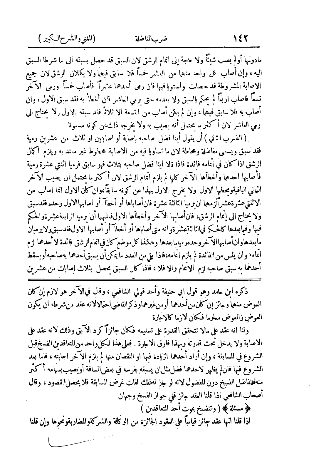 فعلى هذا لكل واحد من المتعاقدين الفسخ قبل الشروع في المسابقة، وإن أراد أحدهما الزيادة فيها أو النقصان منها لم يلزم الآخر إجابته، فأما بعد الشروع فيها فإن لم يظهر لأحدهما فضل مثل أن يسبقه بفرسه في بعض المسافة أو يصيب بسهامه أكثر منه فللفاضل الفسخ دون المفضول لأنه لو جاز له ذلك لفات غرض المسابقة فلا يحصل ا؟ قصود، وقال أصحاب الشافعي إذا قلنا العقد جائز ففي جواز الفسخ وجهان * (مسألة) * (وتنفسخ بموت أحد المتعاقدين) إذا قلنا أنها عقد جائز قياساً على العقود الجائزة من الوكالة والشركة والمضاربة ونحوها وإن قلنا