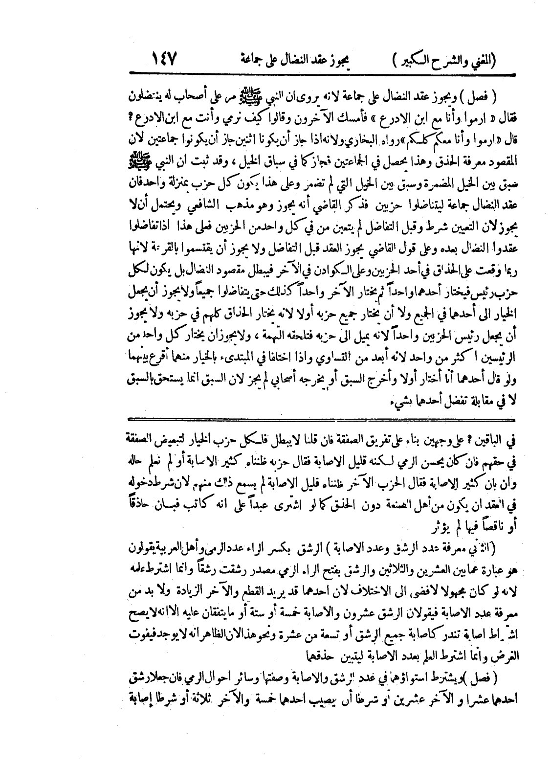 في الباقين؟ على وجهين بناء على تفريق الصفقة فإن قلنا لا يبطل فلكل حزب الخيار لتبعيض الصفقة في حقهم فان كان يحسن الرمي لكنه قليل الاصابة فقال حزبه ظنناه كثير الإصابة أو لم نعلم حاله وإن بان كثير الإصابة فقال الحزب الآخر ظنناه قليل الإصابة لم يسمع ذلك منهم لأن شرط دخوله في العقد أن يكون من أهل الصنعة دون الحذق كما لو اشترى عبداً على أنه كاتب فبان حاذقاً أو ناقصاً فيها لم يؤثر (الثاني معرفة عدد الرشق وعدد الاصابة) الرشق بكسر الراء عدد الرمي وأهل العربية يقولون هو عبارة عما بين العشرين والثلاثين والرشق بفتح الراء الرمي مصدر رشقت رشقاً وإنما اشترط علمه لأنه لو كان مجهولا لأفضى الى الاختلاف لأن أحدهما قد يريد القطع والآخر الزيادة ولابد من معرفة عدد الاصابة فيقولان الرشق عشرون والإصابة خمسة أو ستة أو ما يتفقا عليه إلا أنه لا يصح اشتراط إصابة تندر كإصابة جميع الرشق أو تسعة من عشرة ونحو هذا لأن الظاهر أنه لا يوجد فيفوت الغرض وإنما اشترط العلم بعدد الاصابة ليتبين حذقهما (فصل) ويشترط استواؤهما في عدد الرشق والاصابة وصفتها وسائر احوال الرمي فان جعلا رشق احدهما عشراً والآخر عشرين أو شرطا أن يصيب أحدهما خمسة والآخر ثلاثة أو شرطاً إصابة