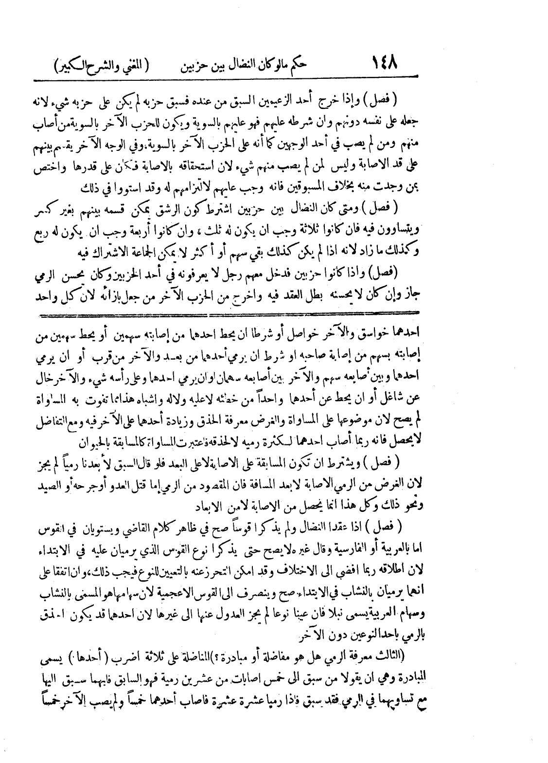 (فصل) ويشترط أن تكون المسابقة على الإصابة لا على البعد فلو قال السبق لأبعدنا رمياً لم يجز لأن الغرض من الرمي الإصابة لا بعد المسافة فإن المقصود من الرمي إما قتل العدو أو جرحه أو الصيد ونحو ذلك وكل هذا إنما يحصل من الإصابة لا من الإبعاد (فصل) إذا عقد النضال ولم يذكرا قوساً صح في ظاهر كلام القاضي ويستويان في القوس إما بالعربية أو الفارسية وقال غيره لا يصح حتى يذكرا نوع القوس الذي يرميان عليه في الابتداء لأن إطلاقه ربما أفضى إلى الاختلاف وقد أمكن التحرز عنه بالتعيين للنوع فيجب ذلك، وإن اتفقا على أنهما يرميان بالنشاب في الابتداء صح وينصرف إلى القوس الأعجمية لأن سهامها هو المسمى بالنشاب وسهام العربية يسمى نبلاً فإن عينا نوعا لم يجز العدول عنها إلى غيرها لأن أحدهما قد يكون أحذق بالرمي بأحد النوعين دون الآخر (الثالث معرفة الرمي هل هو مفاضلة أو مبادرة؟) المناضلة على ثلاثة أضرب (أحدها) يسمى المبادرة وهي أن يقولا من سبق إلى خمس إصابات من عشرين رمية فهو السابق فأيهما سبق إليها مع تساويهما في الرمي فقد سبق فأذا رميا عشرة عشرة فأصاب أحدهما خمساً ولم يصب الآخر خمساً
