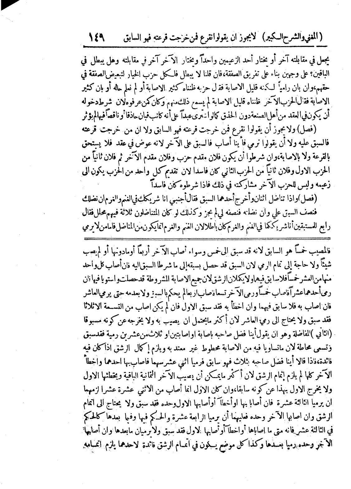 فالمصيب خمساً هو السابق لأنه قد سبق إلى خمس وسواء أصاب الآخر أربعاً أو ما دونها أو لم يصب شيئاً ولا حاجة إلى تمام الرمي لأن السبق قد حصل بسبقه إلى ما شرطا السبق إليه فإن أصاب كل واحد منها من العشر خمساً فلا سابق فيهما ولا يكملان الرشق لأن جميع الإصابة المشروطة قد حصلت واستويا فيها فإن رمى أحدهما عشراً فأصاب خمساً ورمى الآخر تسعاً فأصاب أربعاً لم يحكم بالسبق ولا بعدمه حتى يرمي العاشر فإن أصاب به فلا سابق فيهما وإن أخطأ به فقد سبق الأول فإن لم يكن أصاب من التسعة إلا ثلاثا فقد سبق ولا يحتاج إلى رمي العاشر لأن أكثر ما يحتمل أن يصيب به ولا يخرجه عن كونه مسبوقاً (الثاني) المفاضلة وهو أن يقول أينا فضل صاحبه بإصابة أو إصابتين أو ثلاث من عشرين رمية فقد سبق وتسمى محاطة لأن ما تساويا فيه من الإصابة محطوط غير معتد به ويلزم إكمال الرشق إذا كان فيه فائدة، فإذا قالا أينا فضل صاحبه بثلاث فهو سابق فرميا اثني عشر سهما فأصاب بها أحدهما وأخطأ