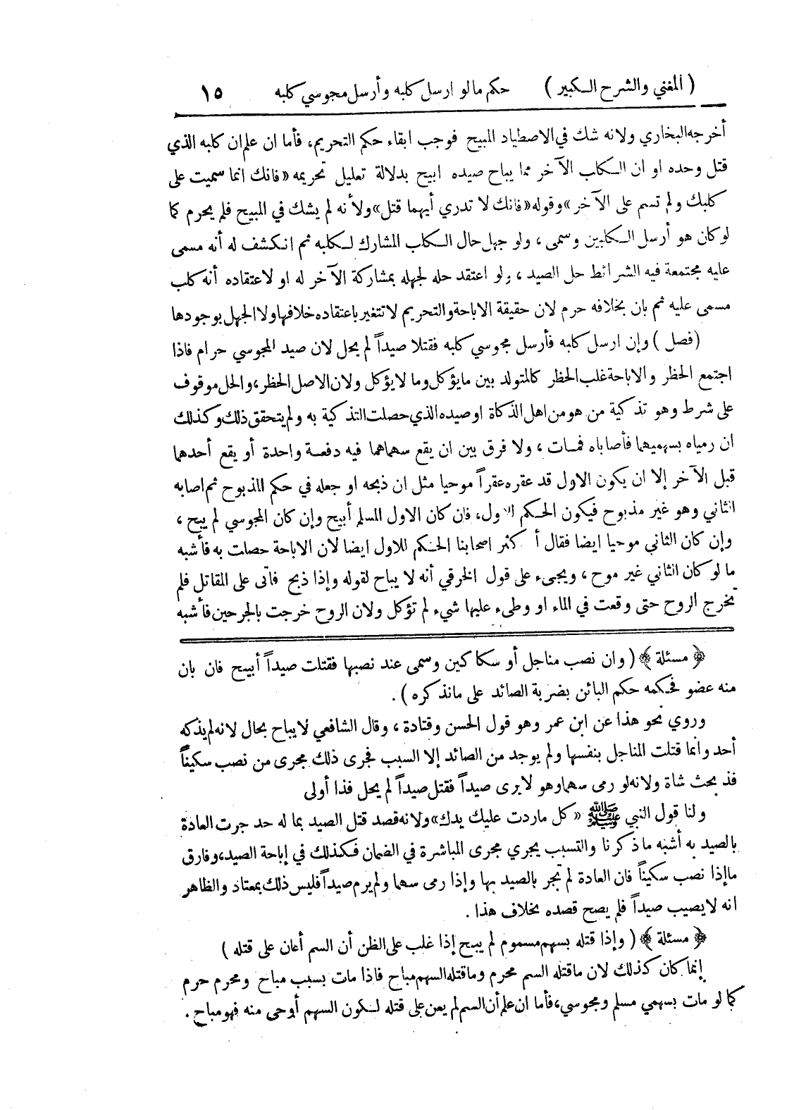 فذ بحث شاة ولأنه لو رمى سهماً وهو لا يرى صيداً فقتل صيداً لم يحل فذا أولى ولنا قول النبي صلى الله عليه وسلم " كل ما ردت عليك يدك " ولأنه قصد قتل الصيد بما له حد جرت العادة بالصيد به أشبه ما ذكرنا والتسبب يجري مجرى المباشرة في الضمان فكذلك في إباحة الصيد، وفارق ما إذا نصب سكيناً فإن العادة لم تجر بالصيد بها وإذا رمى سهماً ولم يرم صيداً فليس ذلك بمعتاد والظاهر أنه لا يصيب صيداً فلم يصح قصده بخلاف هذا.
