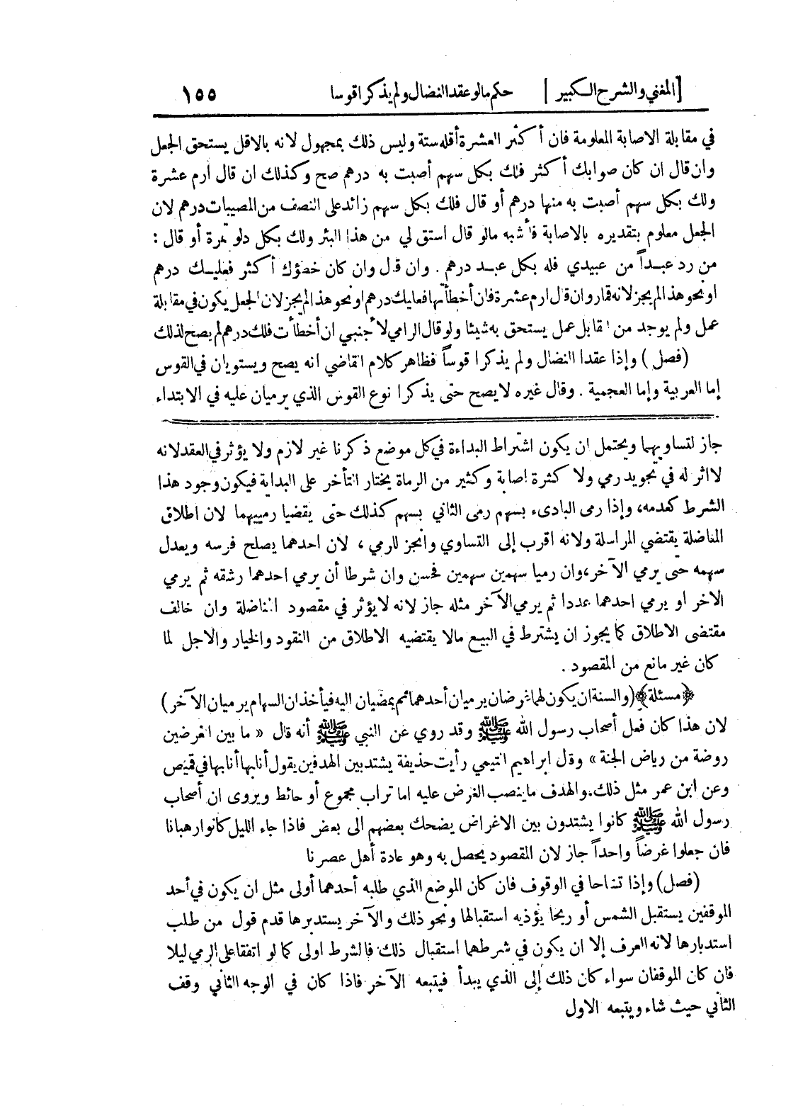 * (مسألة) * (والسنة يكون لهما غرضان يرميان أحدهما ثم يمضيان إليه فيأخذان السهام يرميان الآخر) لأن هذا كان فعل أصحاب رسول الله صلى الله عليه وسلم وقد روي عن النبي صلى الله عليه وسلم أنه قال " ما بين الغرضين روضة من رياض الجنة " وقال إبراهيم التيمي رأيت حذيفة يشتد بين الهدفين يقول أنابها أنابها في قميص وعن ابن عمر مثل ذلك، والهدف ما ينصب الغرض عليه أما تراب مجموع أو حائط ويروى أن أصحاب رسول الله صلى الله عليه وسلم كانوا يشتدون بين الأغراض يضحك بعضهم إلى بعض فإذا جاء الليل كانوا رهباناً فإن جعلوا غرضاً واحداً جاز لأن المقصود يحصل به وهو عادة أهل عصرنا (فصل) وإذا تشاحا في الوقوف فإن كان الموضع الذي طلبه أحدهما أولى مثل أن يكون في أحد الموقفين يستقبل الشمس أو ريحاً يؤذيه استقبالها ونحو ذلك والآخر يستدبرها قدم قول من طلب استدبارها لأنه العرف إلا أن يكون في شرطهما استقبال ذلك فالشرط أولى كما لو اتفقا على الرمي ليلاً