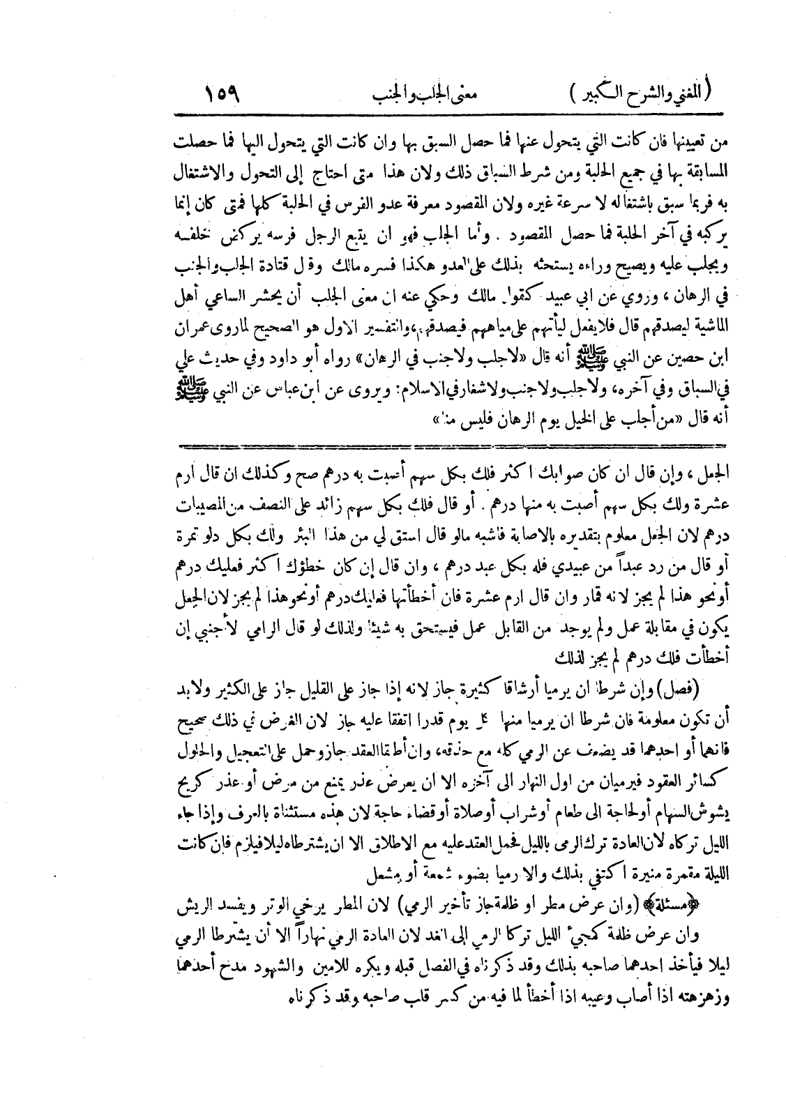 أو قال من رد عبداً من عبيدي فله بكل عبد درهم، وإن قال إن كان خطؤك أكثر فعليك درهم أو نحو هذا لم يجز لأنه قمار وإن قال ارم عشرة فإن أخطأتها فعليك درهم أو نحو هذا لم يجز لأن الجعل يكون في مقابلة عمل ولم يوجد من القابل عمل فيستحق به شيئاً ولذلك لو قال الرامي لأجنبي أن أخطأت فلك درهم لم يجز لذلك (فصل) وإن شرط أن يرميا أرشاقاً كثيرة جاز لأنه إذا جاز على القليل جاز على الكثير ولابد أن تكون معلومة فإن شرطا أن يرميا منها كل يوم قدرا اتفقا عليه جاز لأن الغرض في ذلك صحيح فإنهما أو أحدهما قد يضعف عن الرمي كله مع حذقه، وإن أطلقا العقد جاز وحمل على التعجيل والحلول كسائر العقود فيرميان من أول النهار إلى آخره إلا أن يعرض عذر يمنع من مرض أو عذر كريح يشوش السهام أو لحاجة إلى طعام أو شراب أو صلاة أو قضاء حاجة لأن هذه مستثناة بالعرف وإذا جاء الليل تركاه لأن العادة ترك الرمي بالليل فحمل العقد عليه مع الإطلاق إلا أن يشترطاه ليلا فيلزم فإن كانت الليلة مقمرة منيرة اكتفي بذلك وإلا رميا بضوء شمعة أو مشعل * (مسألة) * (وإن عرض مطر أو ظلمة جاز تأخير الرمي) لأن المطر يرخي الوتر ويفسد الريش وإن عرض ظلمة كمجئ الليل تركا الرمي إلى الغد لأن العادة الرمي نهاراً إلا أن يشترطا الرمي ليلاً فيأخذ أحدهما صاحبه بذلك وقد ذكرناه في الفضل قبله ويكره للأمين والشهود مدح أحدهما وزهرهته إذا أصاب وعيبه إذا أخطأ لما فيه من كسر قلب صاحبه وقد ذكرناه