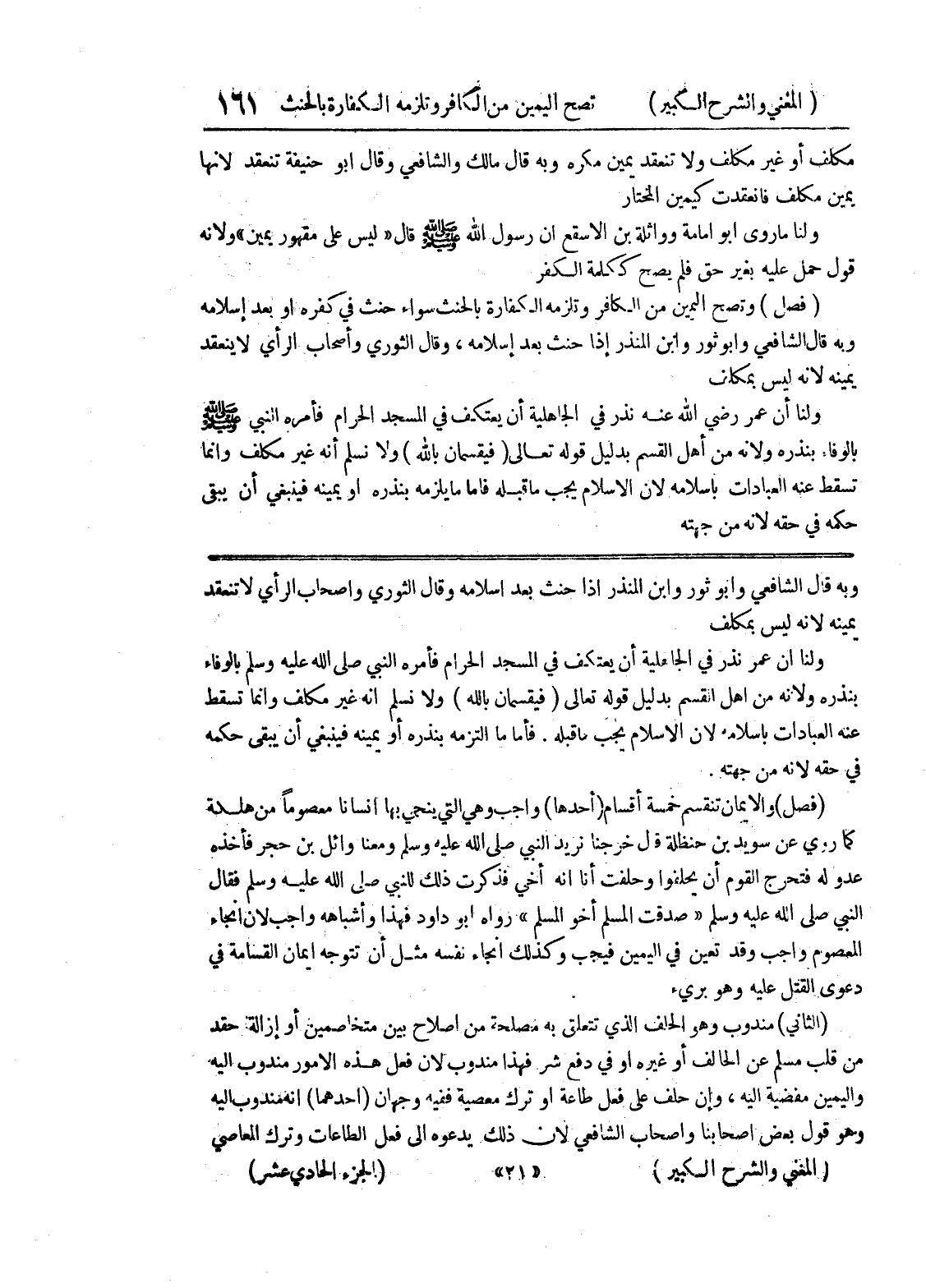 (الثاني) مندوب وهو الحلف الذي تتعلق به مصلحة من إصلاح بين متخاصمين أو إزالة حقد من قلب مسلم عن الحالف أو غيره أو في دفع شر فهذا مندوب لأن فعل هذه الأمور مندوب إليه واليمين مفضية إليه، وإن حلف على فعل طاعة أو ترك معصية ففيه وجهان (أحدهما) أنه مندوب إليه وهو قول بعض أصحابنا وأصحاب الشافعي لأن ذلك يدعوه إلى فعل الطاعات وترك المعاصي