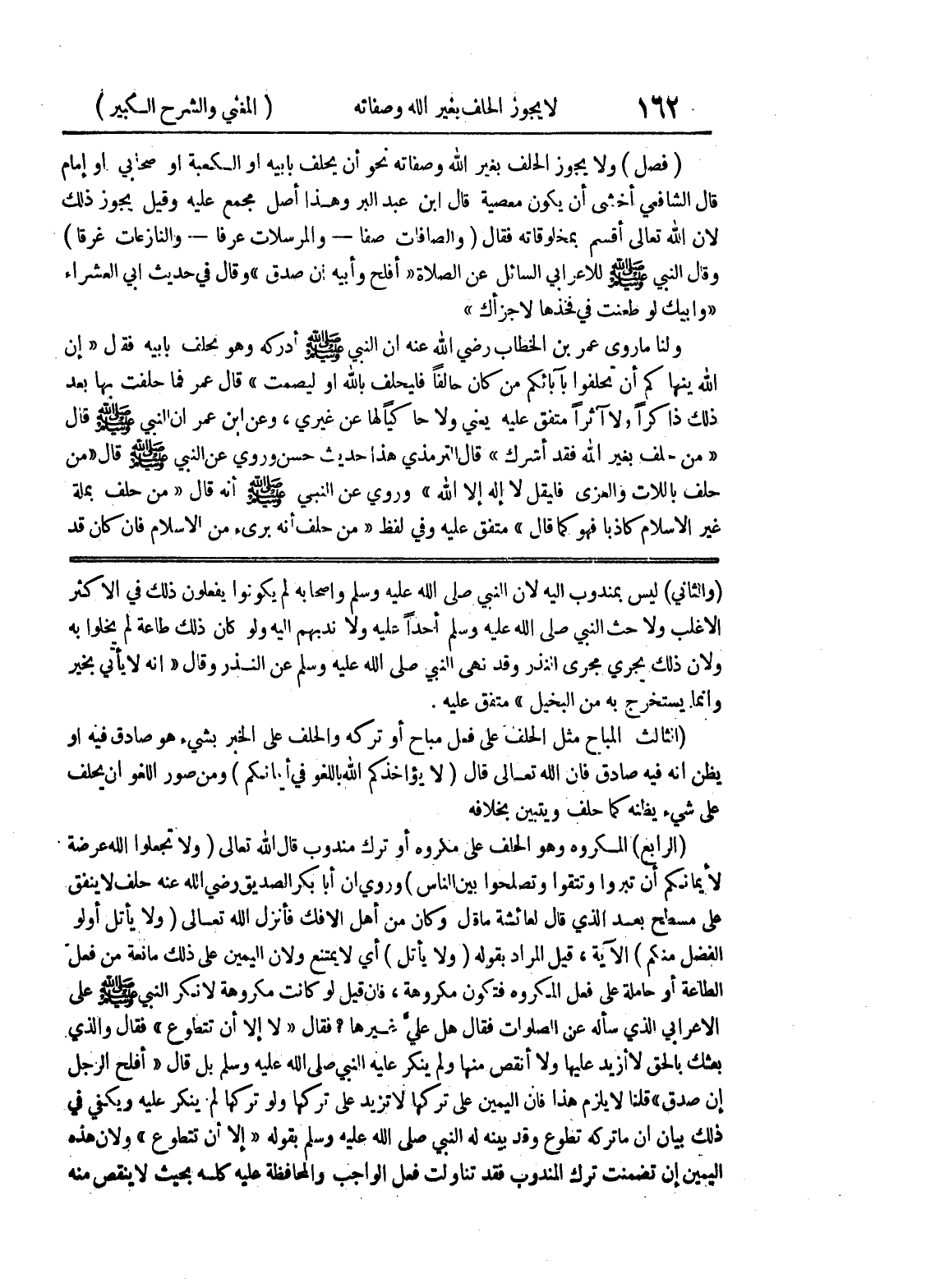 (الثالث المباح الحلف على فعل مباح أو تركه والحلف على الخبر بشئ هو صادق فيه أو يظن أنه فيه صادق فإن الله تعالى قال (لا يؤاخذكم الله باللغو في أيمانكم) ومن صور اللغو أن يحلف على شئ يظنه كما حلف ويتبين بخلافه (الرابع) المكروه وهو الحلف على مكروه أو ترك مندوب قال الله تعالى (ولا تجعلوا الله عرضة لأيمانكم أن تبروا وتتقوا وتصلحوا بين الناس) وروي أن أبا بكر الصديق رضي الله عنه حلف لا ينفق على مسطح بعد الذي قال لعائشة ما قال وكان من اهل الإفك فانزل الله تعالى (ولا يأتل أولو الفضل منكم) الآية، قيل المراد بقوله (ولا يأتل) أي لا يمتنع ولأن اليمين على ذلك مانعة من فعل الطاعة أو حاملة على فعل المكروه فتكون مكروهة، فإن قيل لو كانت مكروهة لانكر النبي صلى الله عليه وسلم على الإعرابي الذي سأله عن الصلوات فقال هل علي غيرها؟ فقال " لا إلا أن تتطوع " فقال والذي بعثك بالحق لا أزيد عليها ولا أنقص منها ولم ينكر عليه النبي صلى الله عليه وسلم بل قال " أفلح الرجل إن صدق " قلنا لا يلزم هذا فإن اليمين على تركها لا تزيد على تركها ولو تركها لم ينكر عليه ويكفي في ذلك بيان إن ما تركه تطوع وقد بينه له النبي صلى الله عليه وسلم بقوله " إلا أن تتطوع " ولأن هذه اليمين إن تضمنت ترك المندوب فقد تناولت فعل الواجب والمحافظة عليه كله بحيث لا ينقص منه