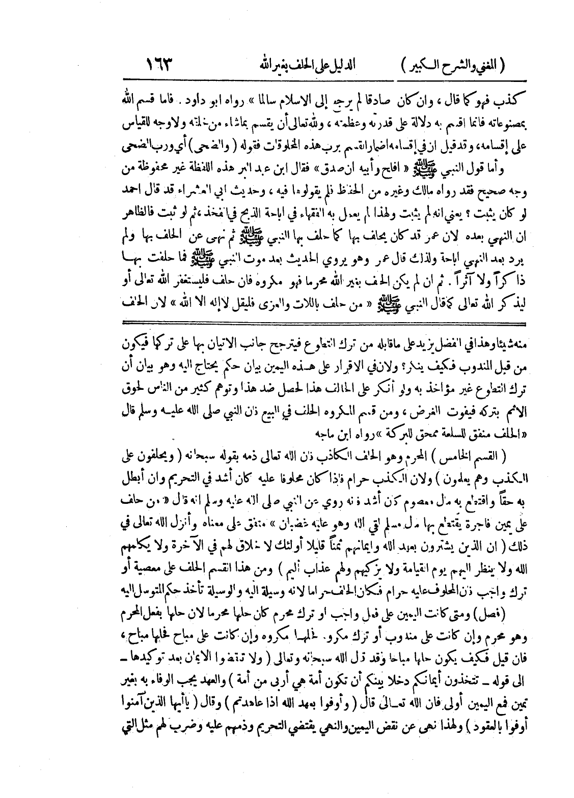 منه شيئاً وهذا في الفضل يزيد على ما قابله من ترك التطوع فيترجح جانب الاتيان بها على تركها فيكون من قبل المندوب فكيف ينكر؟ ولأن في الإقرار على هذه اليمين بيان حكم يحتاج إليه وهو بيان أن ترك التطوع غير مؤاخذ به ولو أنكر على الحالف هذا لحصل ضد هذا وتوهم كثير من الناس لحوق الإثم بتركه فيفوت الغرض، ومن قسم المكروه الحلف في البيع فإن النبي صلى الله عليه وسلم قال " الحلف منفق للسلعة ممحق للبركة " رواه ابن ماجه (القسم الخامس) المحرم وهو الحلف الكاذب فإن الله تعالى ذمه بقوله سبحانه (ويحلفون على الكذب وهم يعلمون) ولأن الكذب حرام فإذا كان محلوفاً عليه كان أشد في التحريم وإن أبطل به حقاً واقتطع به مال معصوم كان أشد فإنه روى عن النبي صلى الله عليه وسلم أنه قال " من حلف على يمين فاجرة يقتطع بها مال مسلم لقي الله وهو عليه غضبان " متفق على معناه وأنزل الله تعالى في ذلك (إن الذين يشترون بعهد الله وأيمانهم ثمنا قليلا أولئك لا خلاق لهم في الآخرة ولا يكلمهم الله ولا ينظر إليهم يوم القيامة ولا يزكيهم ولهم عذاب أليم) ومن هذا القسم الحلف على معصية أو ترك واجب فإن المحلوف عليه حرام فكان الحلف حراما لأنه وسيلة إليه والوسيلة تأخذ حكم المتوسل إليه (فصل) ومتى كانت اليمين على فعل واجب أو ترك محرم كان حلها محرماً لأن حلها بفعل المحرم وهو محرم وإن كانت على مندوب أو ترك مكروه فحلها مكروه وإن كانت على مباح فحلها مباح، فإن قيل فكيف يكون حلها مباحاً وقد قال الله سبحانه وتعالى (ولا تنقضوا الأيمان بعد توكيدها - إلى قوله - تتخذون أيمانكم دخلا بينكم أن تكون أمة هي أربى من أمة) والعهد يجب الوفاء به بغير تمين فمع اليمين أولى فإن الله تعالى قال (وأوفوا بعهد الله إذا عاهدتم) وقال (يا أيها الذين آمنوا أوفوا بالعقود) ولهذا نهى عن نقض اليمين والنهي يقتضي التحريم وذمهم عليه وضرب لهم مثل التي