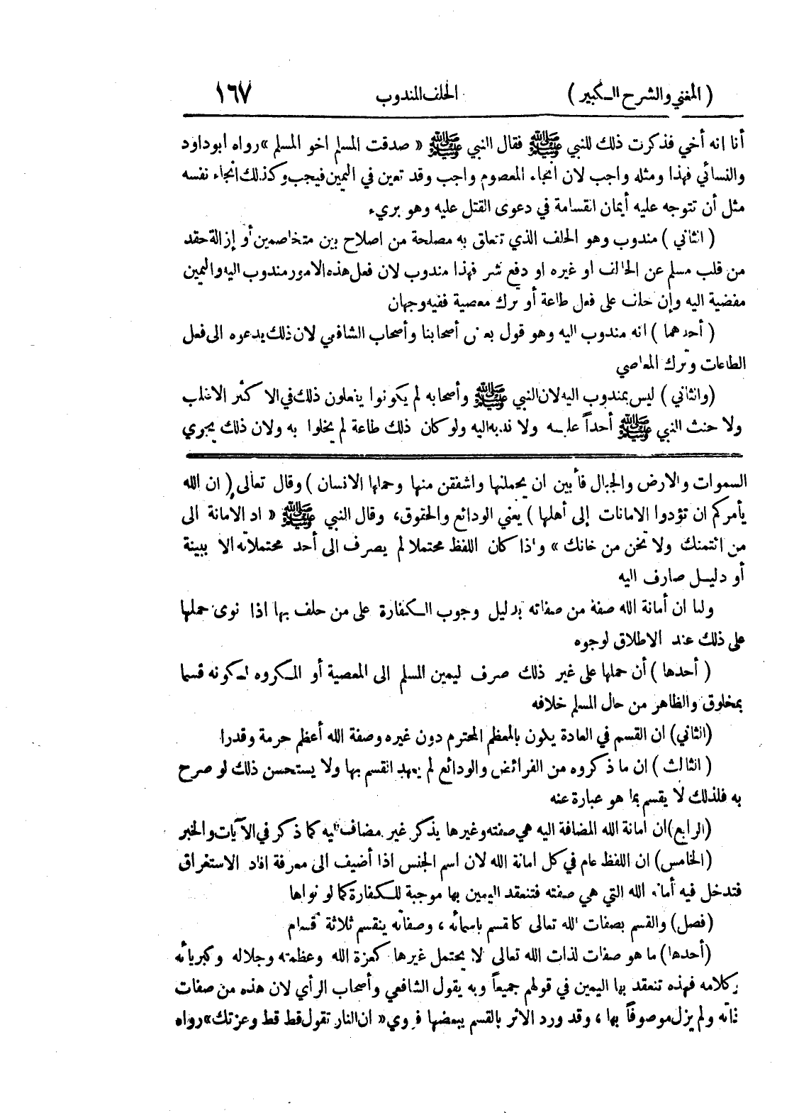 (الرابع) أن أمانة الله المضافة إليه هي صفته وغيرها يذكر غير مضاف إليه كما ذكر في الآيات والخبر (الخامس) إن اللفظ عام في كل أمانة الله لأن اسم الجنس إذا أضيف إلى معرفة أفاد الاستغراق فتدخل فيه أمانة الله التي هي صفته فتنعقد اليمين بها موجبة للكفارة كما لو نواها (فصل) والقسم بصفات الله تعالى كالقسم بأسمائه، وصفاته ينقسم ثلاثة أقسام (أحدها) ما هو صفات لذات الله تعالى لا يحتمل غيرها كعزة الله وعظمته وجلاله وكبريائه وكلامه فهذه تنعقد بها اليمين في قولهم جميعاً وبه يقول الشافعي وأصحاب الرأي لأن هذه من صفات ذاته ولم يزل موصوفاً بها، وقد ورد الأثر بالقسم ببعضها فروي " أن النار تقول قط قط وعزتك " رواه