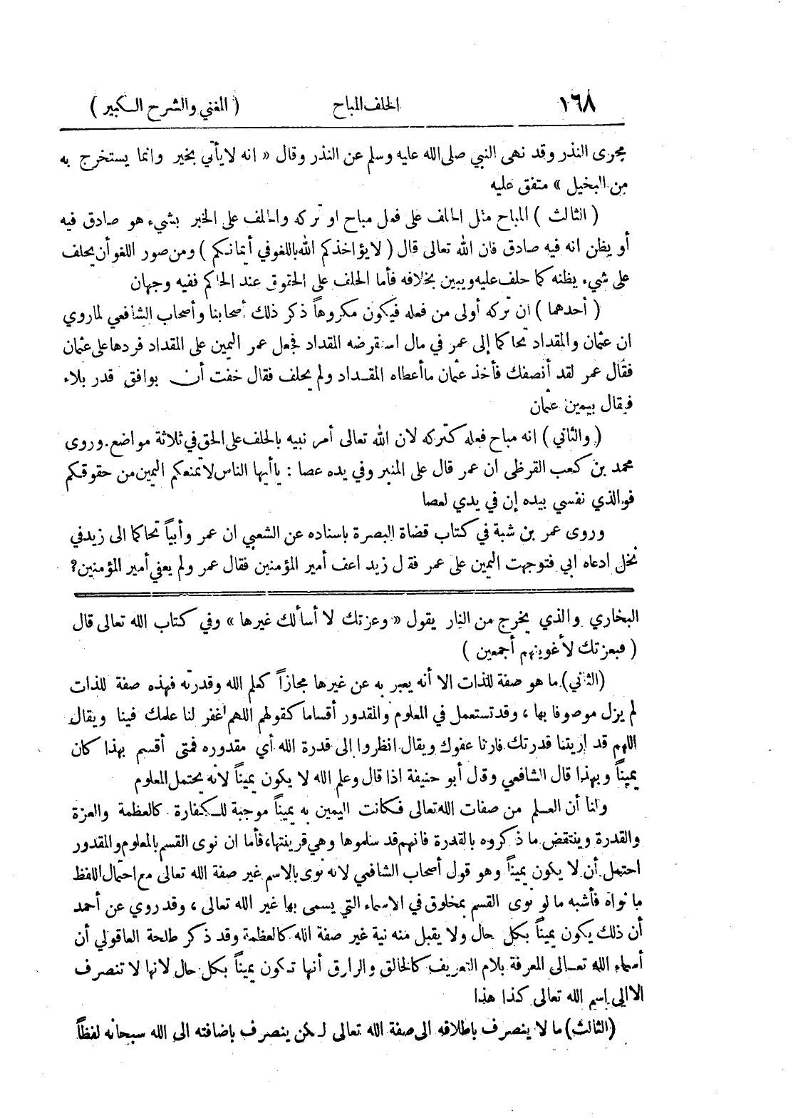 البخاري والذي يخرج من النار يقول " وعزتك لا أسألك غيرها " وفي كتاب الله تعالى قال (فبعزتك لأغوينهم أجمعين) (الثاني) ما هو صفة للذات إلا أنه يعبر به عن غيرها مجازاً كعلم الله وقدرته فهذه صفة للذات لم يزل موصوفاً بها، وقد تستعمل في المعلوم والمقدور أقساماً كقولهم اللهم اغفر لنا علمك فينا ويقال اللهم قد أريتنا قدرتك فأرنا عفوك ويقال انظروا إلى قدرة الله أي مقدوره فمتى أقسم بهذا كان يميناً وبهذا قال الشافعي وقال أبو حنيفة اذا قال وعلم الله لا يكون يميناً لأنه يحتمل المعلوم ولنا أن العلم من صفات الله تعالى فكانت اليمين به يميناً موجبة للكفارة كالعظمة والعزة والقدرة وينتقض ما ذكروه بالقدرة فانه قد سلموها وهي قرينتها، فأما إن نوى القسم بالمعلوم والمقدور احتمل أن لا يكون يميناً وهو قول أصحاب الشافعي لأنه نوى بالإسم غير صفة الله تعالى مع احتمال اللفظ ما نواه فأشبه ما لو نوى القسم بمخلوق في الأسماء التي يسمى بها غير الله تعالى، وقد روي عن أحمد أن ذلك يكون يميناً بكل حال ولا يقبل منه نية غير صفة الله كالعظمة وقد ذكر طلحة العاقولي إن أسماء الله تعالى المعرفة بلام التعريف كالخالق والرازق أنها تكون يميناً بكل حال لأنها لا تنصرف إلا إلى اسم الله تعالى كذا هذا (الثالث) ما لا ينصرف بإطلاقه إلى صفة الله تعالى لكن ينصرف بإضافته إلى الله سبحانه لفظاً