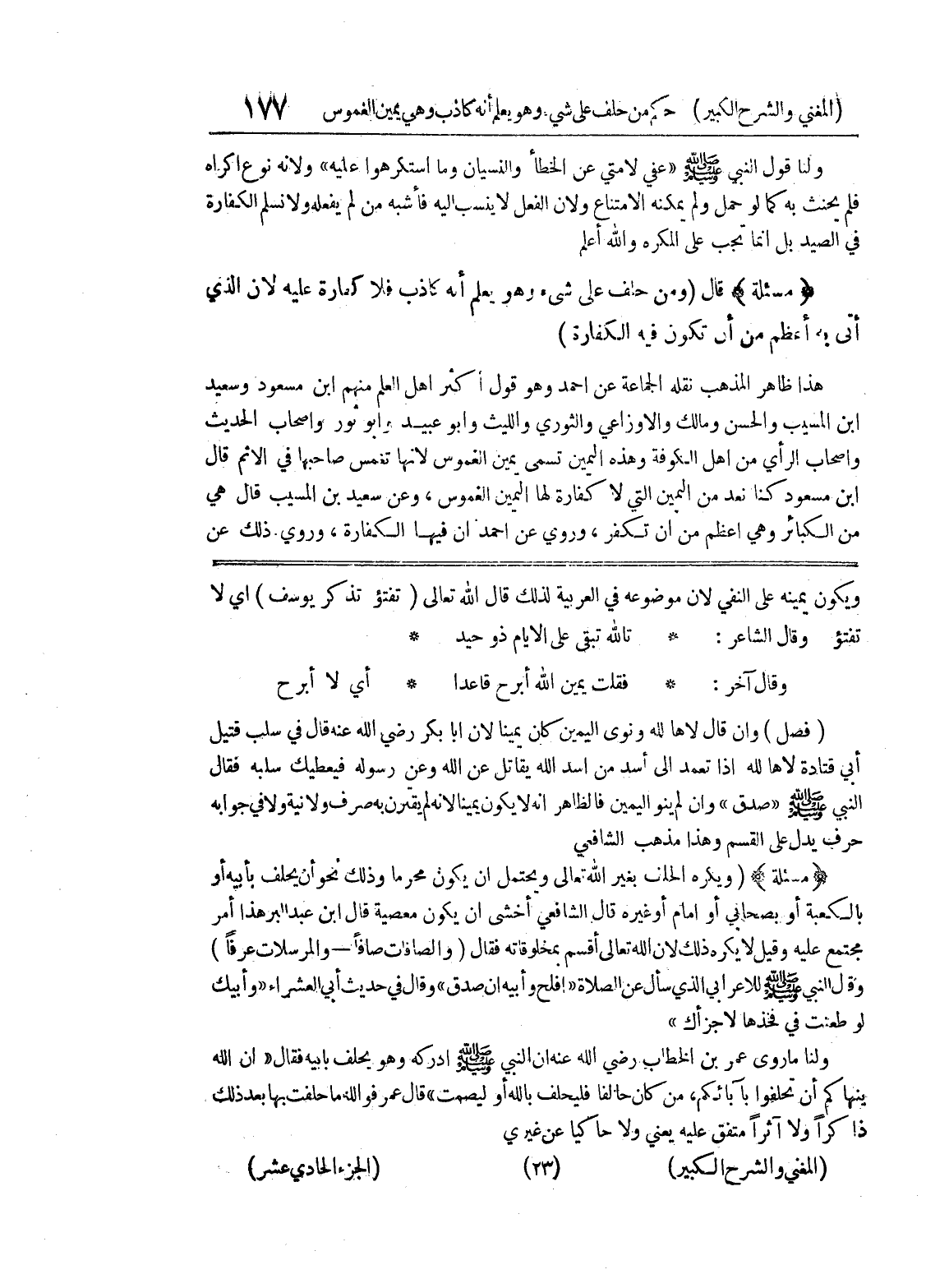 ويكون يمينه على النفي لأن موضوعه في العربية لذلك قال الله تعالى (تفتؤ تذكر يوسف) أي لا تفتؤ وقال الشاعر: * تالله تبقى على الأيام ذو حيد * وقال آخر: * فقلت يمين الله أبرح قاعداً * أي لا أبرح (فصل) وإن قال لاها لله ونوى اليمين كان يميناً لأن أبا بكر رضي الله عنه قال في سلب قتيل أبي قتادة لاها لله إذا تعمد إلى أسد من أسد الله يقاتل عن الله وعن رسوله فيعطيك سلبه فقال النبي صلى الله عليه وسلم " صدق " وإن لم ينو اليمين فالظاهر أنه لا يكون يميناً لأنه لم يقترن به صرف ولا نية ولا في جوابه حرف يدل على القسم وهذا مذهب الشافعي * (مسألة) * (ويكره الحلف بغير الله تعالى ويحتمل أن يكون محرما وذلك نحو أن يحلف بأبيه أو