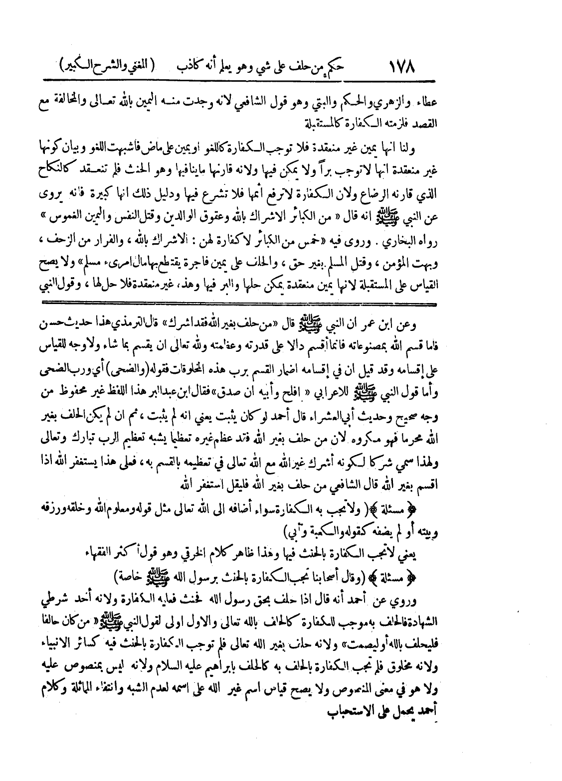 وعن ابن عمر أن النبي صلى الله عليه وسلم قال " من حلف بغير الله فقد أشرك " قال الترمذي هذا حديث حسن فأما قسم الله بمصنوعاته فأنما أقسم دالا على قدرته وعظمته ولله تعالى أن يقسم بما شاء ولا وجه للقياس على إقسامه وقد قيل إن في إقسامه اضمار القسم برب هذه المخلوقات فقوله (والضحى) أي ورب الضحى وأما قول النبي صلى الله عليه وسلم للإعرابي " أفلح وأبيه إن صدق " فقال ابن عبد البر هذا اللفظ غير محفوظ من وجه صحيح وحديث أبي العشراء قال أحمد لو كان يثبت يعني أنه لم يثبت، ثم إن لم يكن الحلف بغير الله محرماً فهو مكروه لأن من حلف بغير الله فقد عظم غيره تعظيماً يشبه تعظيم الرب تبارك وتعالى ولهذا سمي شركا لكونه اشرك غير الله مع الله تعالى في تعظيمه بالقسم به، فعلى هذا يستغفر الله إذا أقسم بغير الله قال الشافعي من حلف بغير الله فليقل استغفر الله * (مسألة) * (ولا تجب به الكفارة سواء أضافه إلى الله تعالى مثل قوله ومعلوم الله وخلقه ورزقه وبيته أو لم يضفه كقوله والكعبة وأبي) ويعني لا تجب الكفارة بالحنث فيها وهذا ظاهر كلام الخرقي وهو قول أكثر الفقهاء * (مسألة) * (وقال أصحابنا تجب الكفارة بالحنث برسول الله صلى الله عليه وسلم خاصة) وروى عن أحمد أنه قال إذا حلف بحق رسول الله فحنث فعليه الكفارة ولانه أخذ شرطي الشهادة فالحلف به موجب للكفارة كالحلف بالله تعالى والأول أولى لقول النبي صلى الله عليه وسلم " من كان حالفاً