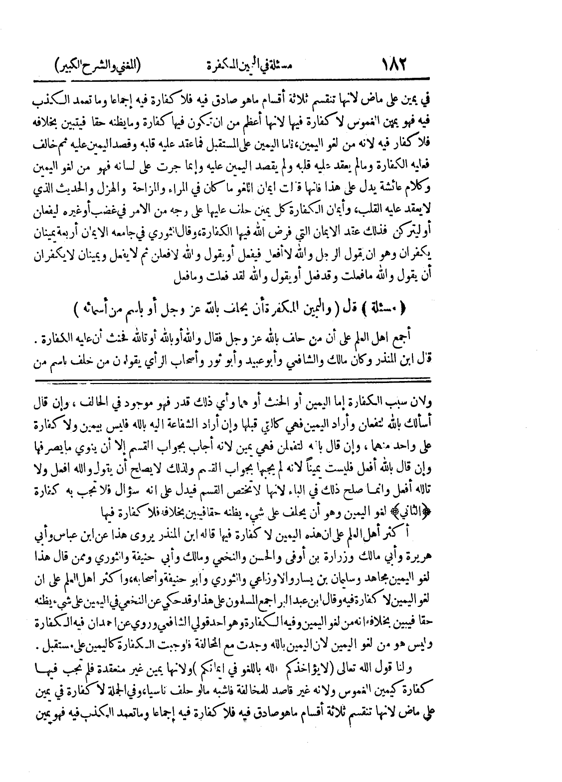 * (الثاني) * لغو اليمين وهو أن يحلف على شئ يظنه حقا فيبين بخلافه فلا كفارة فيها أكثر أهل العلم على أن هذه اليمين لا كفارة فيها قاله ابن المنذر يروى هذا عن ابن عباس وأبي هريرة وأبي مالك وزرارة بن أوفى والحسن والنخعي ومالك وأبي حنيفة والثوري وممن قال هذا لغو اليمين مجاهد وسليمان بن يسار والاوزاعي والثوري وأبو حنيفة وأصحابه، وأكثر أهل العلم على أن لغو اليمين لا كفارة فيه وقال ابن عبد البر أجمع المسلمون على هذا وقد حكي عن النخعي في اليمين على شئ يظنه حقا فيبين بخلافه أنه من لغو اليمين وفيه الكفارة وهو أحد قولي الشافعي وروي عن أحمد أن فيه الكفارة وليس هو من لغو اليمين لأن اليمين بالله وجدت مع المخالفة فأوجبت الكفارة كاليمين على مستقبل.
