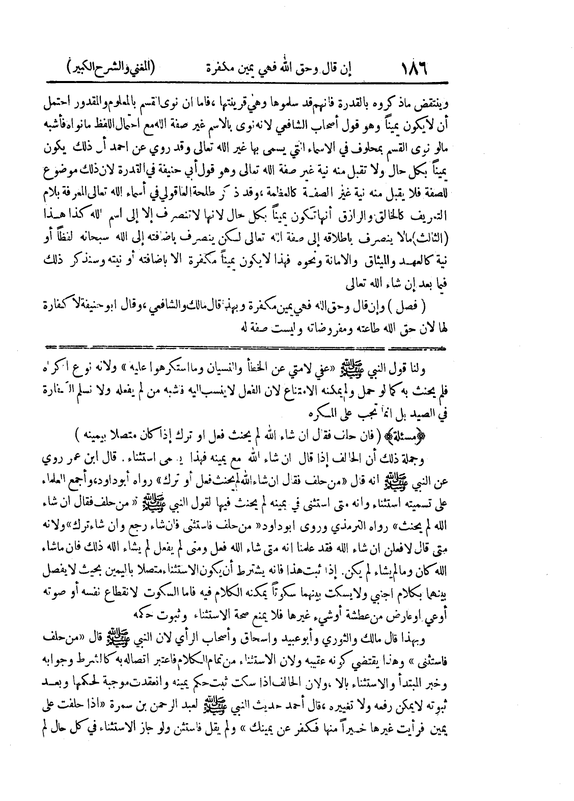 قال ابن عمر روى عن النبي صلى الله عليه وسلم أنه قال " من حلف فقال إن شاء الله لم يحنث فعل أو ترك " رواه أبو داود، وأجمع العلماء على تسميته استثناء وأنه متى استثنى في يمينه لم يحنث فيها لقول النبي صلى الله عليه وسلم " من حلف فقال إن شاء الله لم يحنث " رواه الترمذي وروى أبو داود " من حلف فاستثنى فإن شاء رجع وإن شاء ترك " ولأنه متى قال لأفعلن إن شاء الله فقد علمنا أنه متى شاء الله فعل ومتى لم يفعل لم يشاء الله ذلك فإن ما شاء الله كان وما لم يشاء لم يكن.