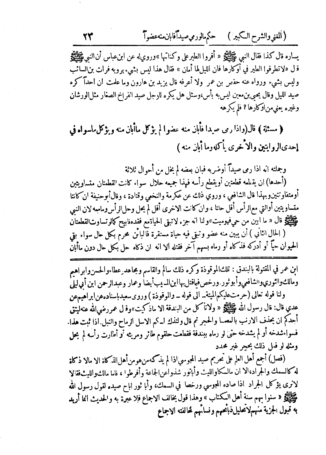 إذا ثبت هذا فسواء شدخه أو لم يشدخه حتى لو رماه ببندقة فقطعت حلقوم طائر ومريئه أو أطارت راسه لم يحل ومثله لو فعل ذلك بحجر غير محدد (فصل) أجمع أهل العلم على تحريم صيد المجوسي إذا لم يذكه من هو من أهل الذكاة الا مالا ذكاة له كالسمك والجراد، إلا أن مالكا والليث وأبا ثور شذوا عن الجماعة وأفرطوا، فأما مالك والليث فقالا لا نرى يؤكل الجراد إذا صاده المجوسي ورخصا في السمك، وأبا ثور أباح صيده لقول رسول الله صلى الله عليه وسلم " سنوا بهم سنة أهل الكتاب " وهذا قول يخالف الإجماع فلا عبرة به والحديث إنما أريد به قبول الجزية منهم لا تحليل ذبائحهم ونسائهم لمخالفته الإجماع