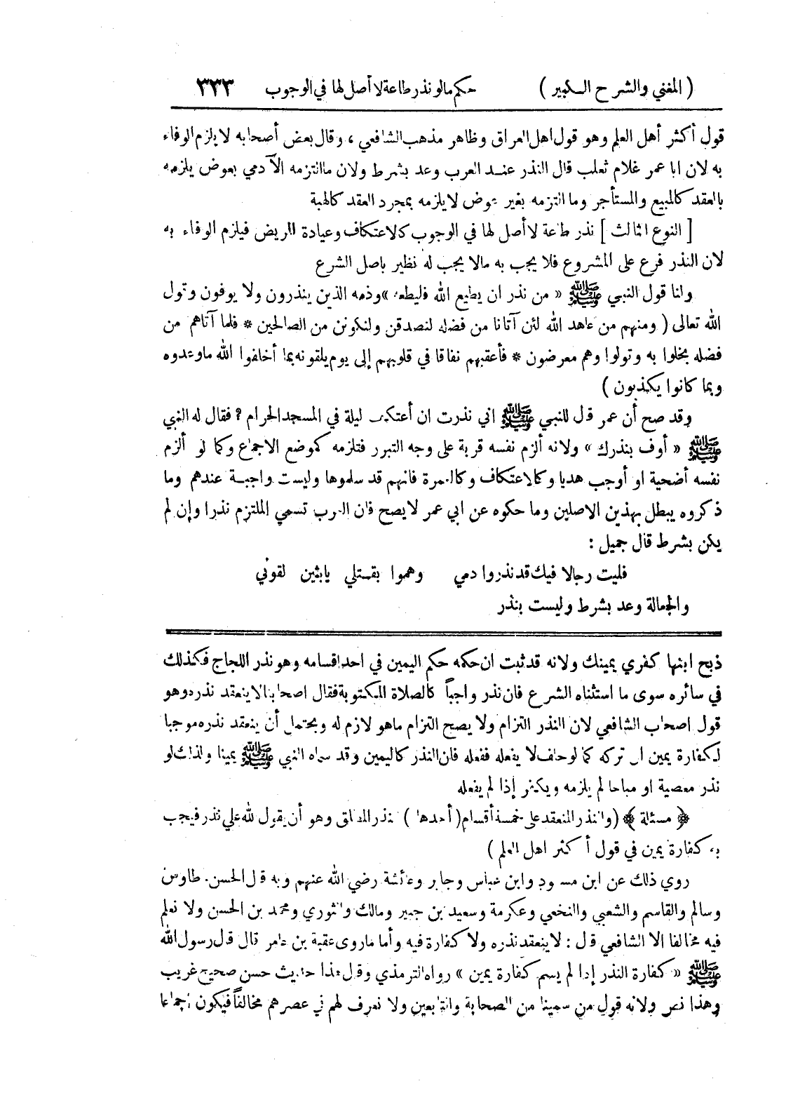 ذبح ابنها كفري يمينك ولأنه قد ثبت أن حكمه حكم اليمين في أحد أقسامه وهو نذر اللجاج فكذلك في سائره سوى ما استثناه الشرع فإن نذر واجباً كالصلاة المكتوبة فقال أصحابنا لا ينعقد نذره وهو قول أصحاب الشافعي لان النذر التزام ولا يصح التزام ما هو لازم له ويحتمل ان ينعقد نذره موجباً لكفارة يمين ان تكره كما لو حلف لا يفعله ففعله فإن النذر كاليمين وقد سماه النبي صلى الله عليه وسلم يميناً ولذلك لو نذر معصية أو مباحا لم يلزمه ويكفر إذا لم يفعله * (مسألة) * (والنذر المنعقد على خمسة أقسام (أحدها) النذر المطلق وهو أن يقول لله علي نذر فيجب به كفارة يمين في قول أكثر أهل العلم) روي ذلك عن ابن مسعود وبان عباس وجابر وعائشة رضي الله عنهم وبه قال الحسن وطاوس وسالم والقاسم والشعبي والنخعي وعكرمة وسعيد بن جبير ومالك والثوري ومحمد بن الحسن ولا نعلم