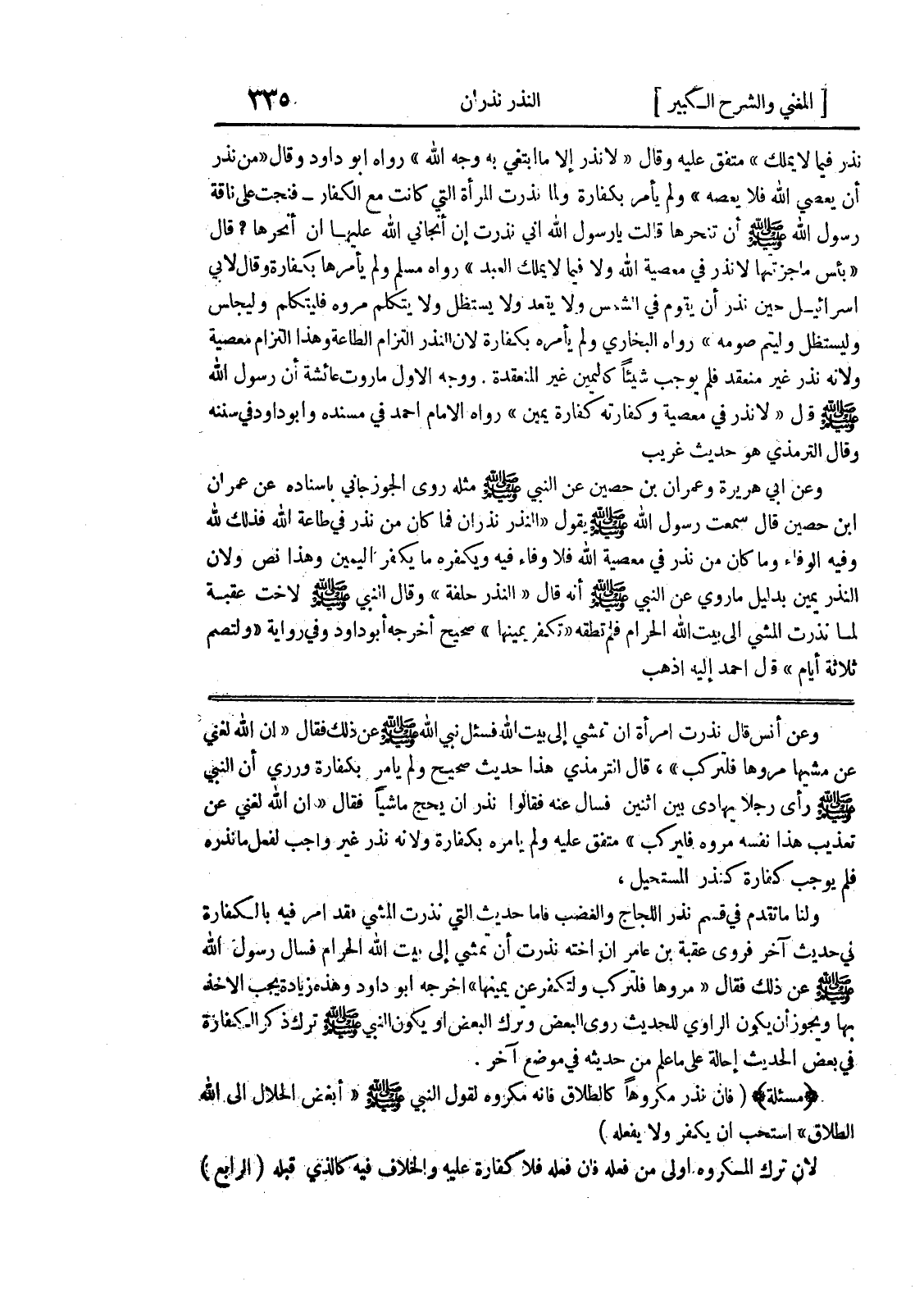 صلى الله عليه وسلم رأى رجلاً يهادى بين اثنين فسأل عنه فقالوا نذر أن يحج ماشياً فقال " إن الله لغني عن تعذيب هذا نفسه مروه فليركب " متفق عليه ولم يأمره بكفارة ولأنه نذر غير واجب لفعل ما نذره فلم يوجب كفارة كنذر المستحيل، ولنا ما تقدم في قسم نذر اللجاج ولا غضب فأما حديث التي نذرت المشي فقد أمر فيه بالكفارة في حديث آخر فروى عقبة بن عامر أن أخته نذرت أن تمشي إلى بيت الله الحرام فسأل رسول الله صلى الله عليه وسلم عن ذلك فقال " مروها فلتركب ولتكفر عن يمينها " أخرجه أبو داود وهذه زيادة يجب الأخذ بها ويجوز أن يكون الراوي للحديث روى البعض وترك البعض أو يكون النبي صلى الله عليه وسلم ترك ذكر الكفارة في بعض الحديث إحالة على ما علم من حديثه في موضع آخر.