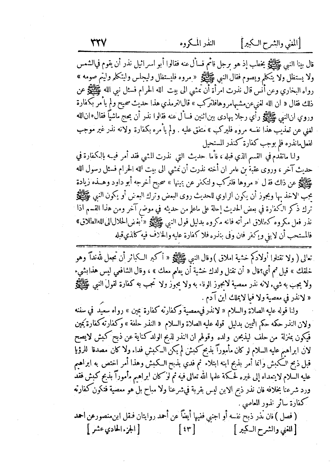 ولنا قوله عليه الصلاة والسلام " لا نذر في معصية وكفارته كفارة يمين " رواه سعيد في سننه ولأن النذر حكمه حكم اليمين بدليل قوله عليه الصلاة والسلام " النذر حلفة " وكفارته كفارة يمين فيكون بمنزلة من حلف ليذبحن ولده وقولهم أن النذر لذبح الولد كناية عن ذبح كبش لا يصح لأن ابراهيم عليه السلام لو كان مأموراً بذبح كبش لم يكن الكبش فداء ولا كان مصدقاً للرؤيا قبل ذبح الكبش وإنما أمر بذبح ابنه ابتلاء ثم فدي بذبح الكبش وهذا أمر اختص به ابراهيم عليه السلام لا يتعداه إلى غيره لحكمة علمها الله تعالى فيه ثم لو كان ابراهيم مأموراً بذبح كبش فقد ورد شرعنا بخلافه فإن نذر ذبح الابن ليس بقربة في شرعنا ولا مباح بل هو معصية فتكون كفارته كفارة سائر نذور المعاصي.