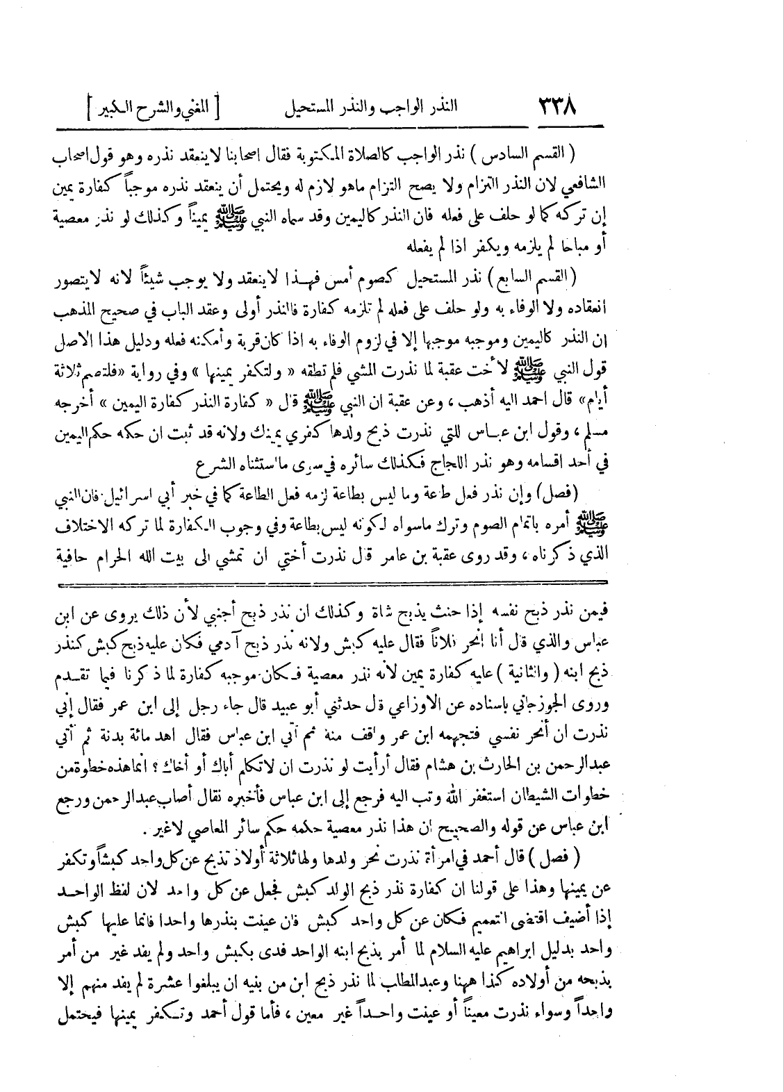 وروى الجوزجاني بإسناده عن الأوزاعي قال حدثني أبو عبيد قال جاء رجل إلى ابن عمر فقال إني نذرت إن أنحر نفسي فتجهمه ابن عمر واقف منه ثم أتى ابن عباس فقال أهد مائة بدنة ثم أتى عبد الرحمن بن الحارث بن هشام فقال أرأيت لو نذرت أن لا تكلم أباك أو أخاك؟ إنما هذه خطوة من خطوات الشيطان استغفر الله وتب إليه فرجع إلى ابن عباس فأخبره نقال أصاب عبد الرحمن ورجع ابن عباس عن قوله والصحيح أن هذا نذر معصية حكمه حكم سائر المعاصي لا غير.