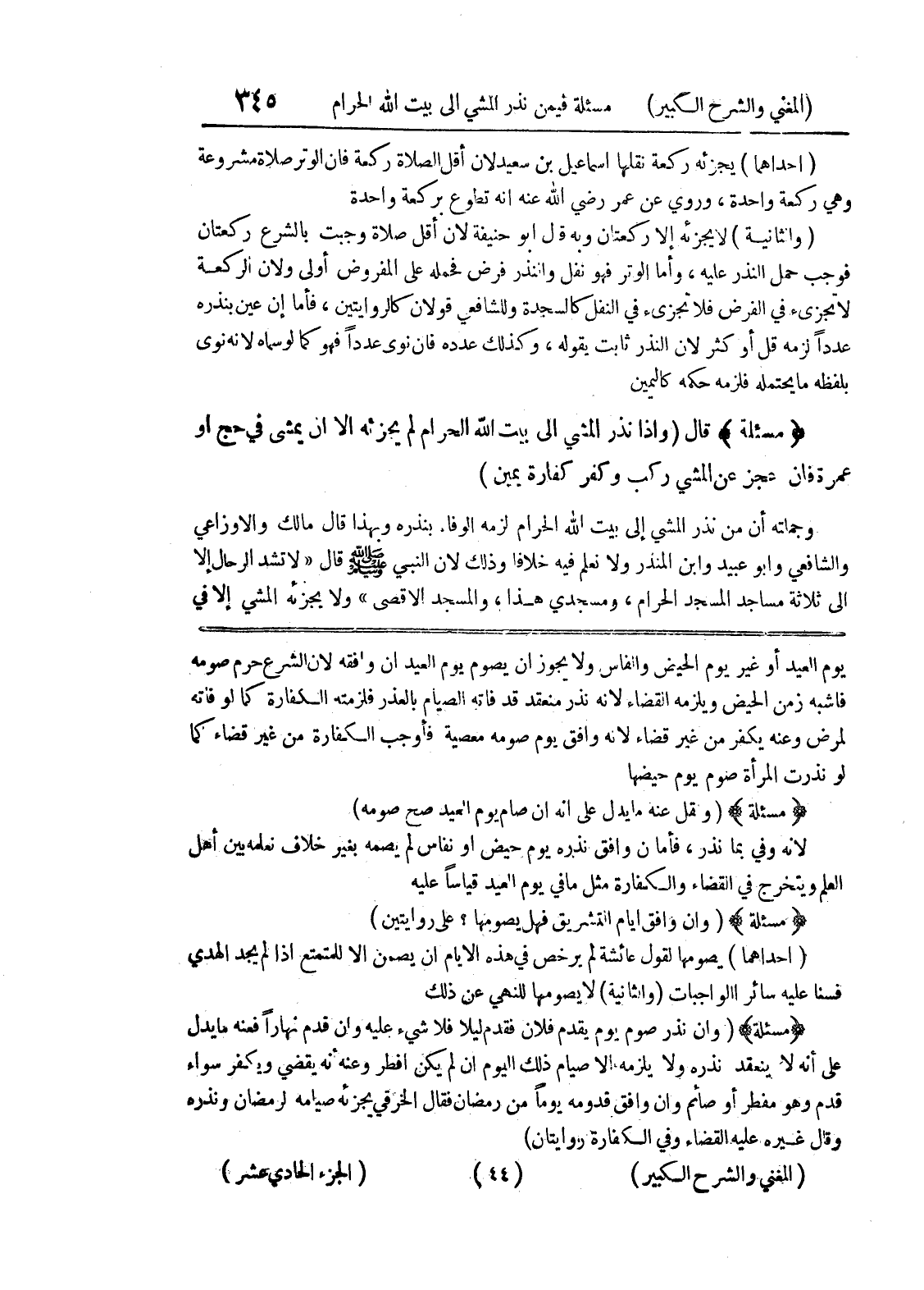 يوم العيد أو غير يوم الحيض والنفاس ولا يجوز أن يصوم يوم العيد أن وافقه لأن الشرع حرم صومه فأشبه زمن الحيض ويلزمه القضاء لأنه نذر منعقد قد فاته الصيام بالعذر فلزمته الكفارة كما لو فاته لمرض وعنه يكفر من غير قضاء لأنه وافق يوم صومه معصية فأوجب الكفارة من غير قضاء كما لو نذرت المرأة صوم يوم حيضها * (مسألة) * (ونقل عنه ما يدل على أنه أن صام يوم العيد صح صومه) لأنه وفى بما نذر، فأما إن وافق نذره يوم حيض أو نفاس لم يصمه بغير خلاف نعلمه بين أهل العلم ويتخرج في القضاء والكفارة مثل ما في يوم العيد قياساً عليه * (مسألة) * (وإن وافق أيام التشريق فهل يصومها؟ على روايتين) (إحداهما) يصومها لقول عائشة لم يرخص في هذه الأيام أن يصمن إلا للمتمتع إذا لم يجد الهدي