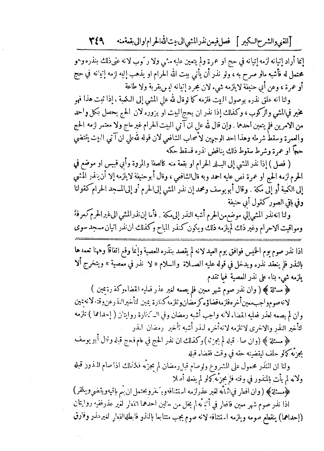 إذا نذر صوم يوم الخميس فوافق يوم العيد لأنه لم يقصد بنذره المعصية وإنما وقع اتفاقا وههنا وتعمدها بالنذر فلم ينعقد نذره ويدخل في قوله عليه الصلاة والسلام " لا نذر في معصية " ويتخرج ألا يلزمه شئ بناء على نذر المعصية فيما تقدم * (مسألة) * (وإن نذر صوم شهر معين فلم يصمه لغير عذر فعليه القضاء وكفارة يمين) لأنه صوم واجب معين أخره فلزمه قضاؤه كرمضان وتلزمه كفارة يمين لتأخير النذر عن وقته لأنه يمين وان لم يصمه لعذر فعليه القضاء لأنه واجب أشبه رمضان وفي الكفارة روايتان (إحداهما) تلزمه لتأخير النذر والأخرى لا تلزمه لأنه أخره لعذر أشبه تأخير رمضان ل؟ ذر * (مسألة) * (وإن صام قبله لم يجزئه) وكذلك إن نذر الحج في عام فحج قبله وقال أبو يوسف يجزئه كما لو حلف ليقضينه حقه في وقت فقضاه قبله ولنا ان المنذر محمول على المشروع ولو صام قبل رمضان لم يجزئه فكذلك إذا صام المنذور قبله ولأنه لم يأت بالمنذور في وقته فلم يجزئه كما لو لم يفعله أصلا * (مسألة) * (وإن أفطر في أثنائه لغير عذر لزمه استئنافه ويكفر ويحتمل أن يتم باقيه ويقضي ويكفر) إذا نذر صوم شهر معين فافطر في اثنائه لم يخل من حالين أحدهما الفطر لغير عذر ففيه روايتان (إحداهما) ينقطع صومه ويلزمه استئنافه لانه صوم يجب متتابعاً بالنذر فأبطله الفطر لغير عذر وفارق